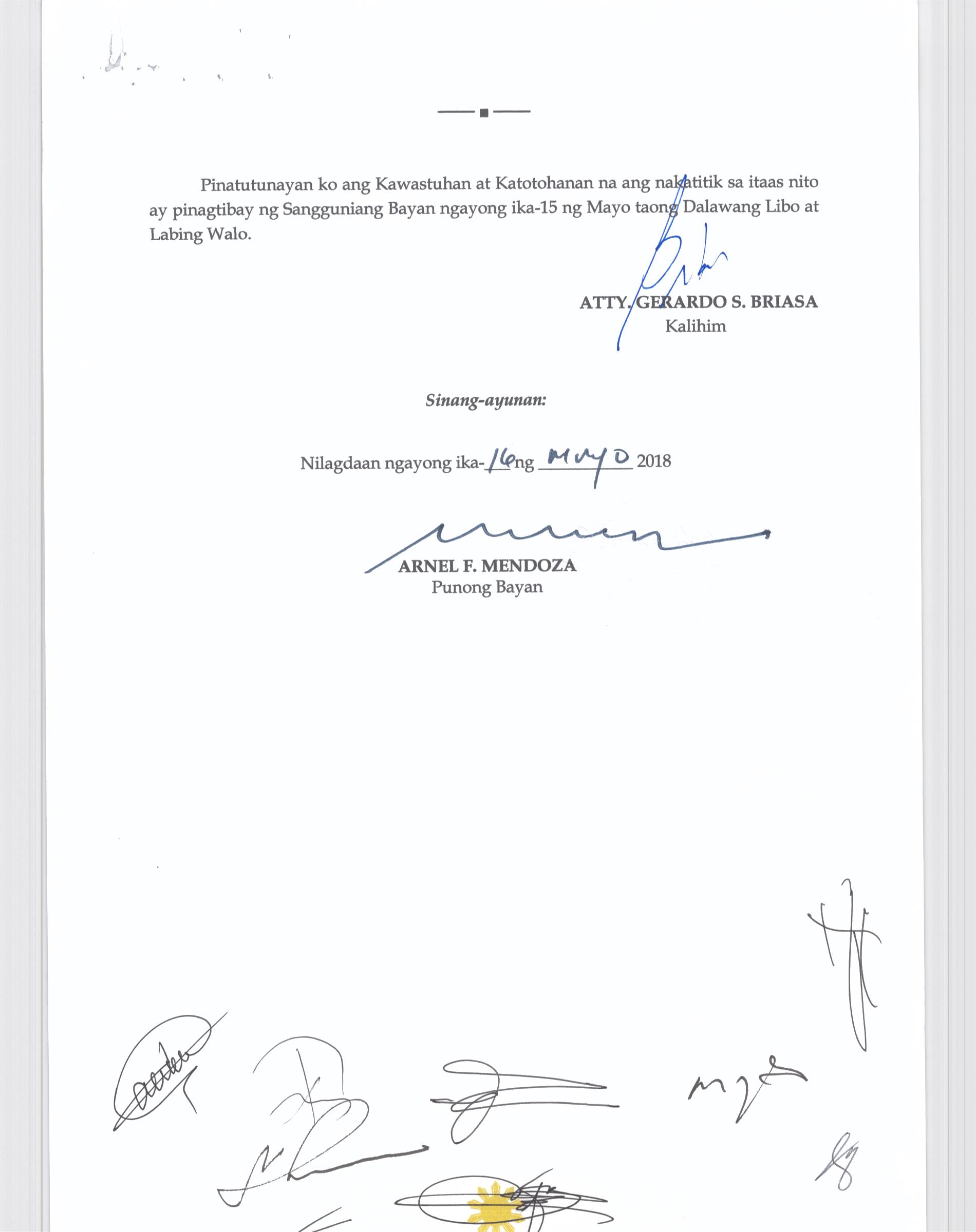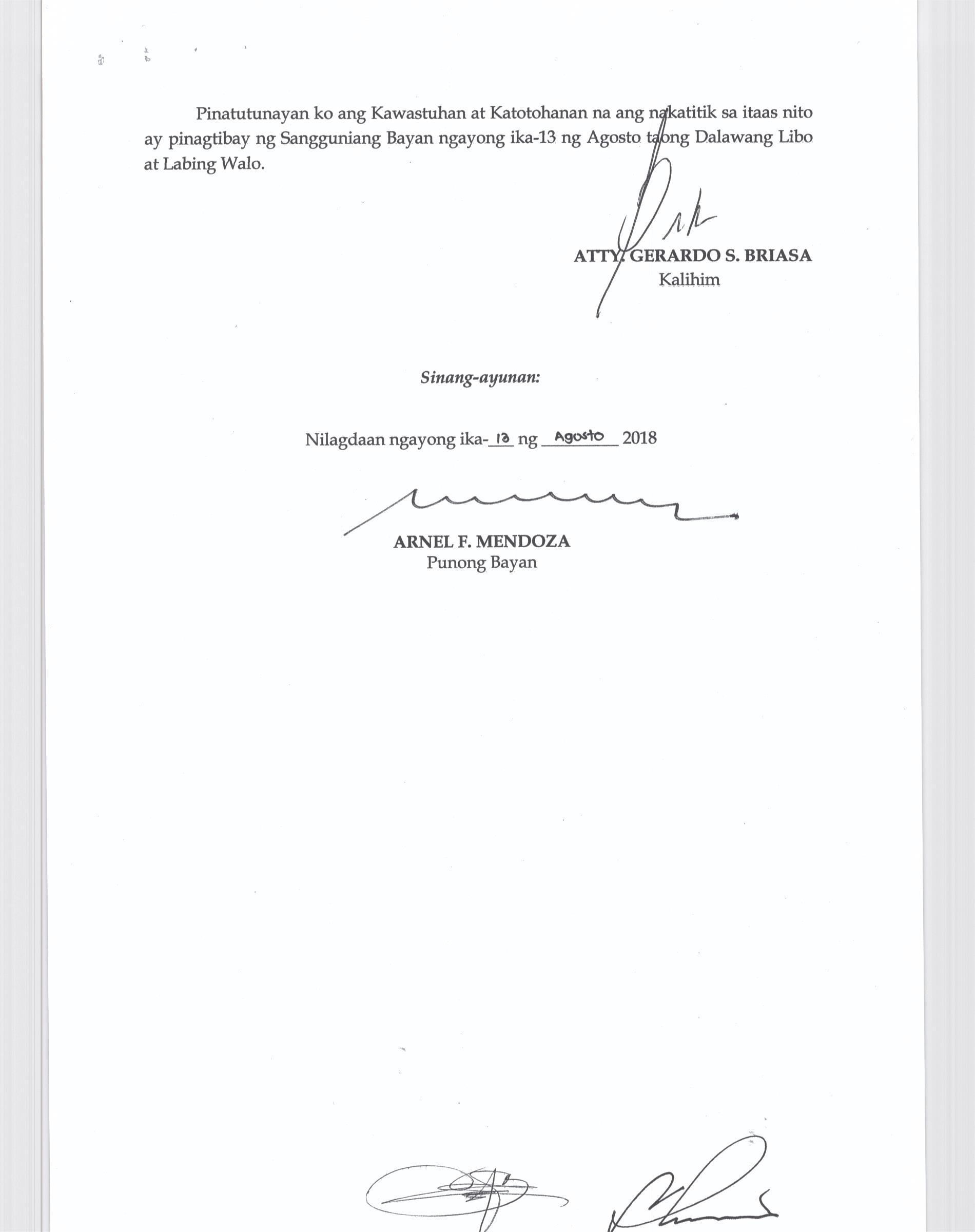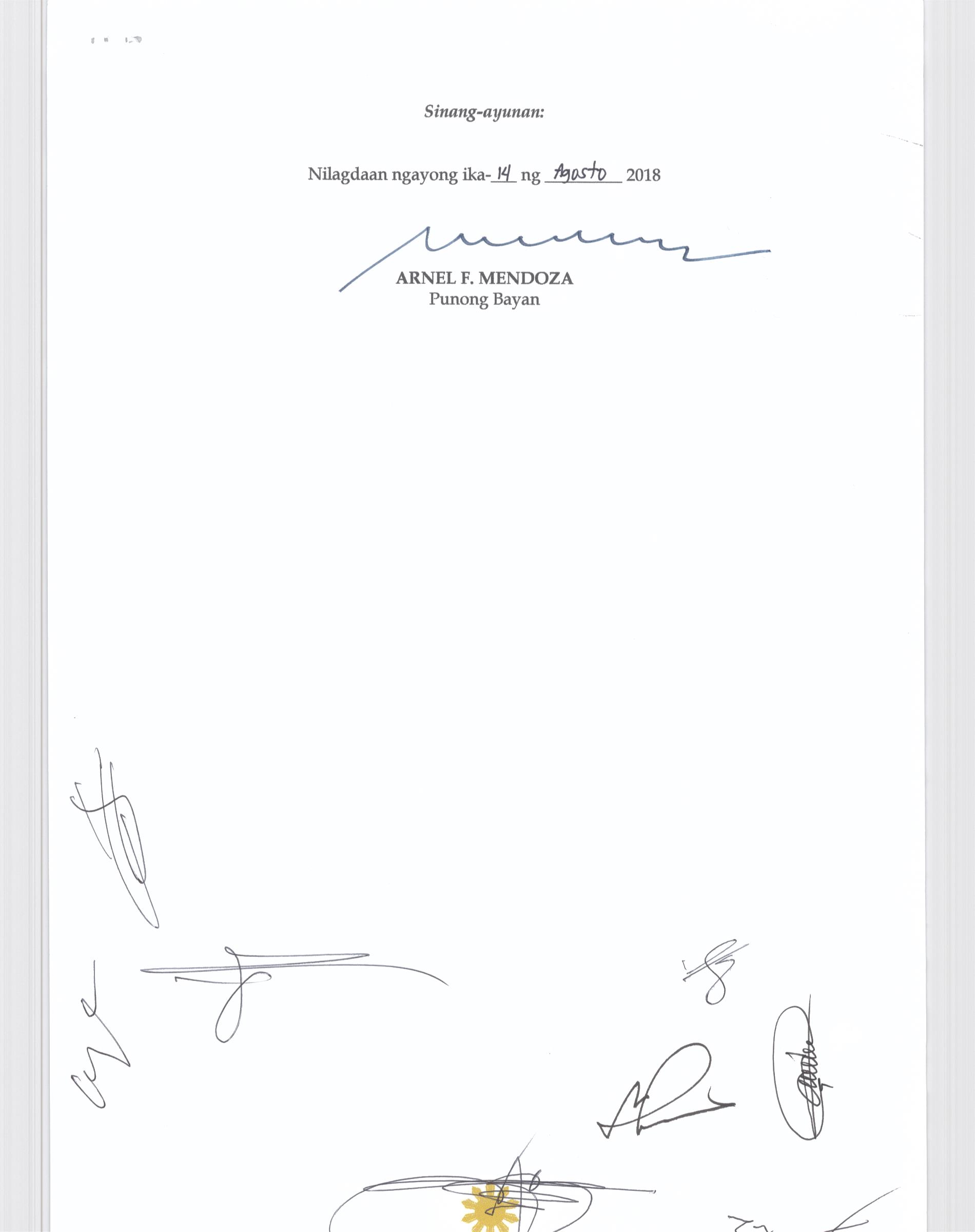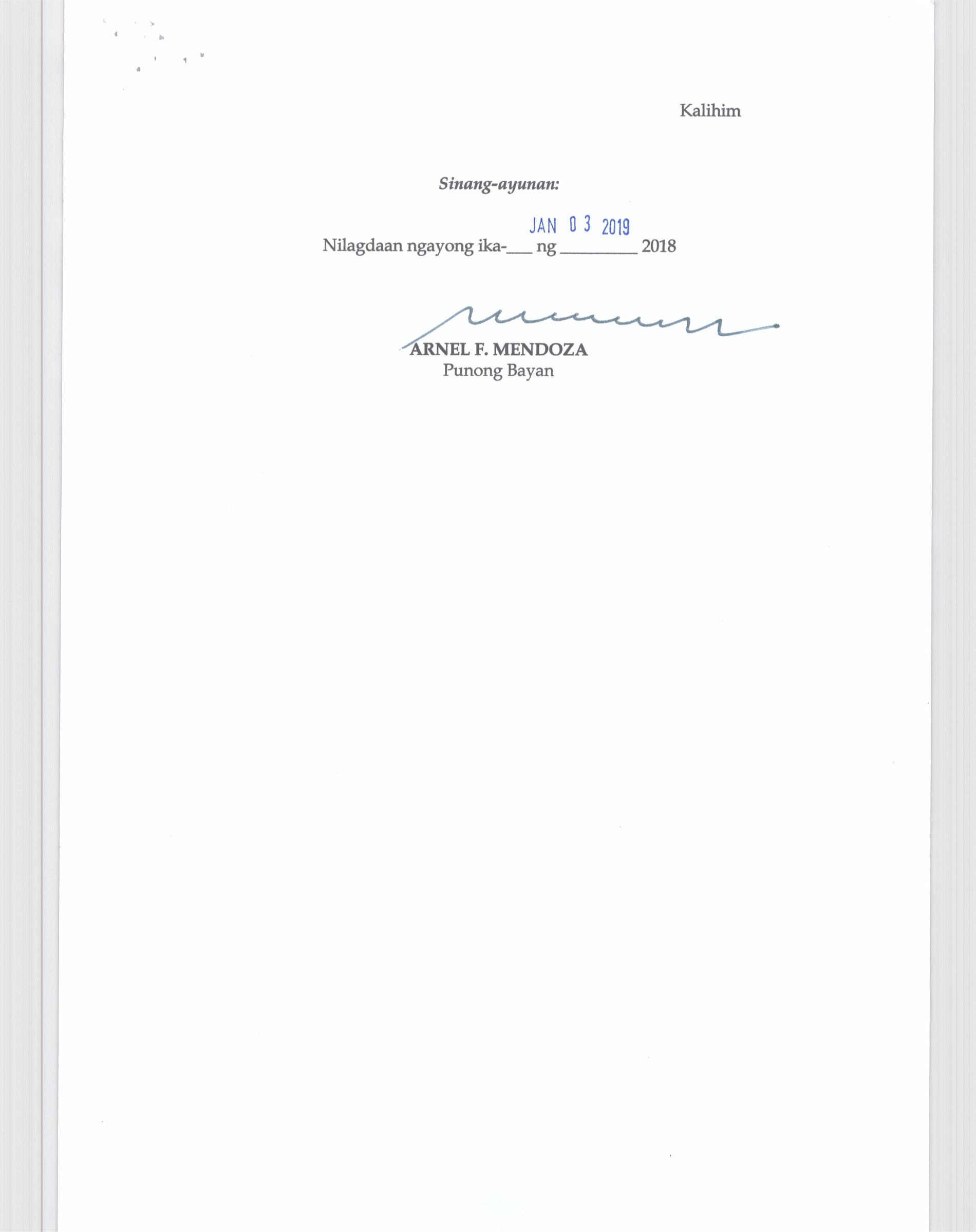 Isang Kautusang nagpapatibay sa Paglikha ng Posisyon ng Municipal risk Reduction and Management Officer lll na may salary Grade 18 (1) sa Ilalim ng Tanggapan ng Punong Bayan.