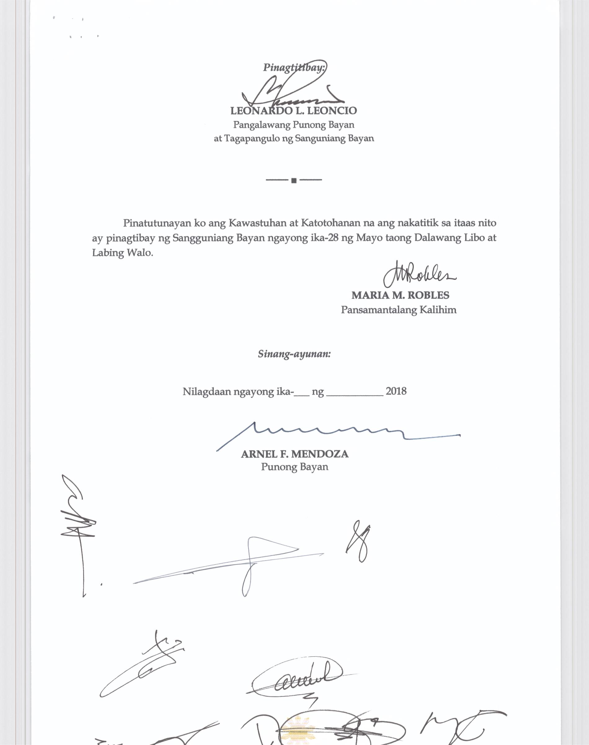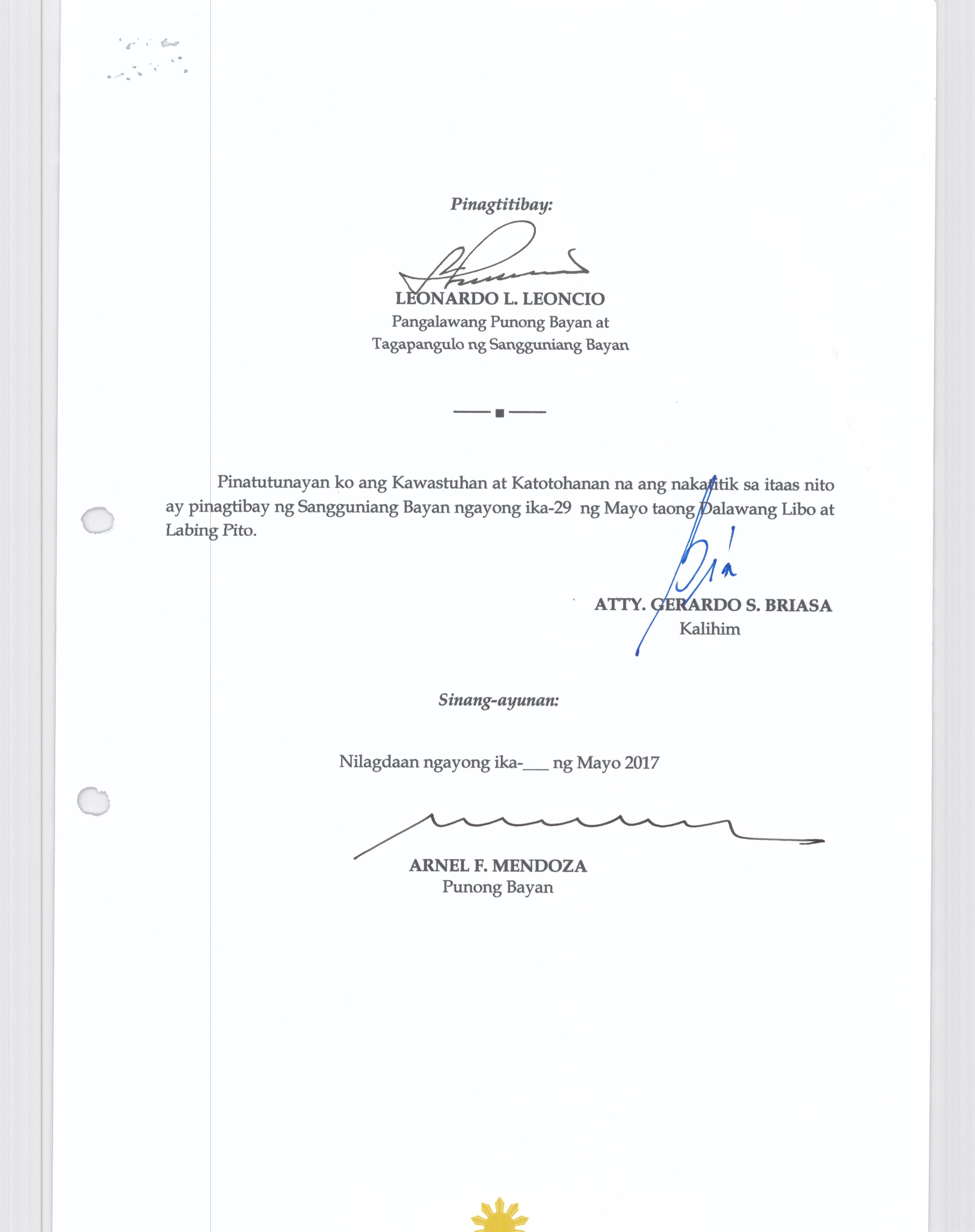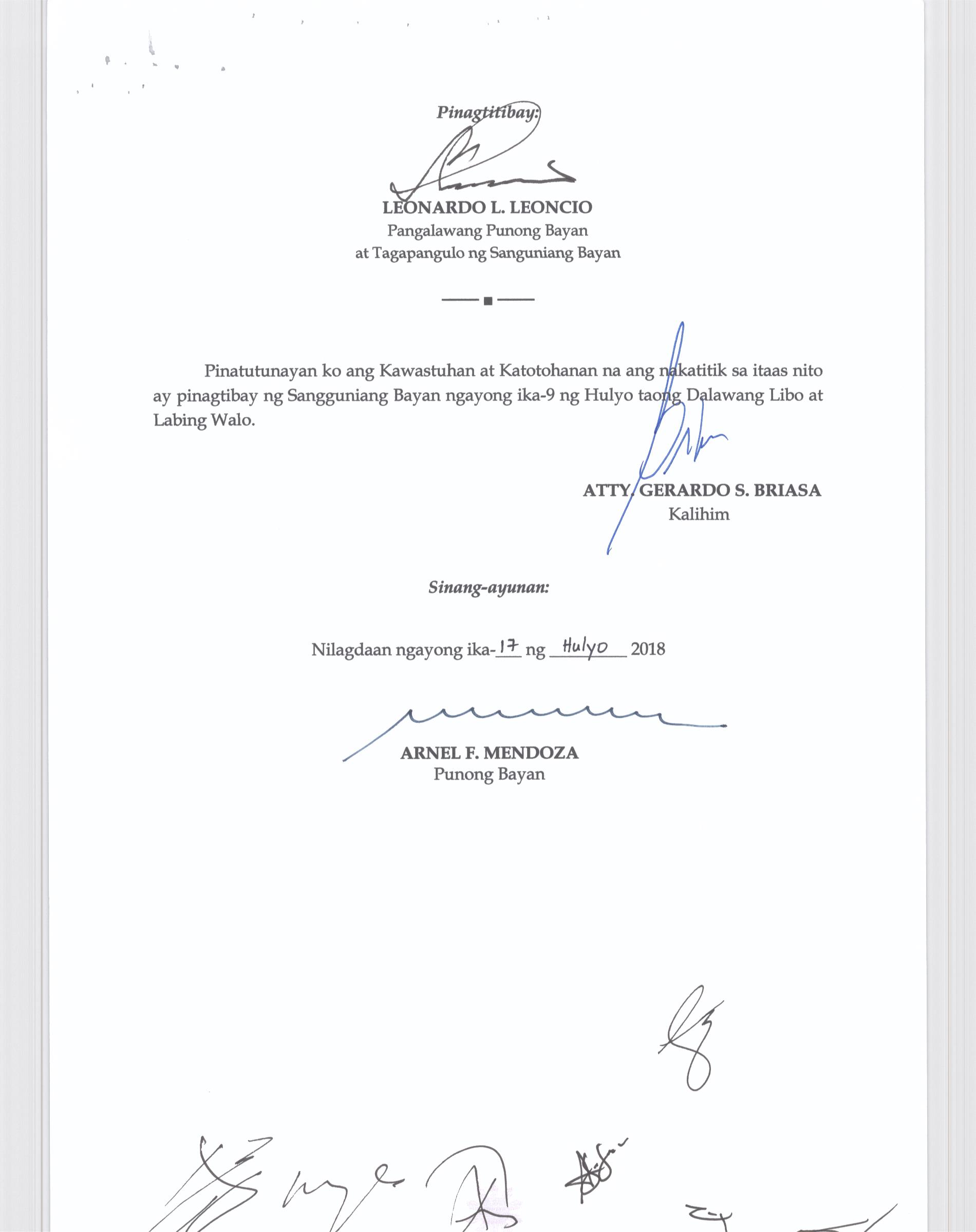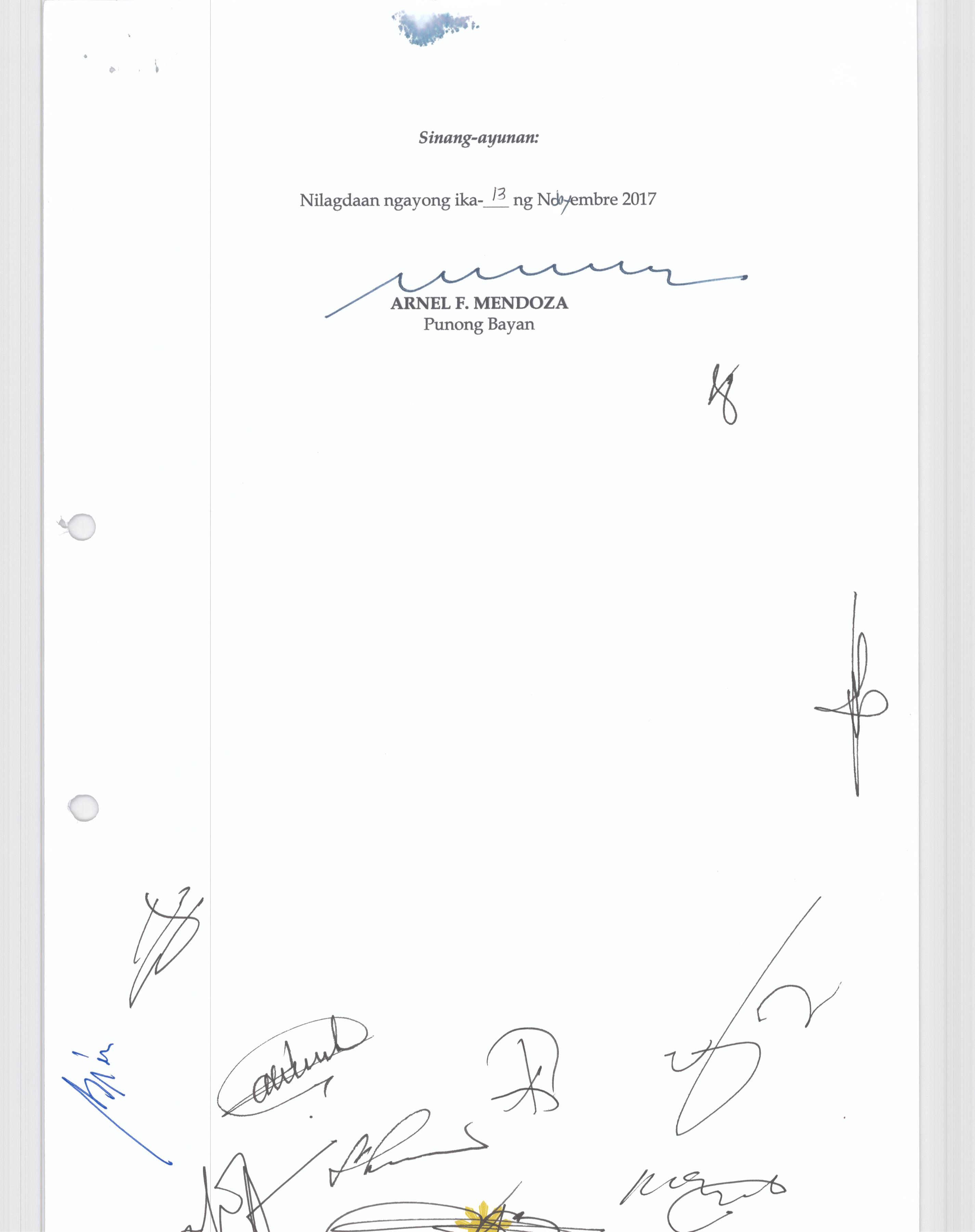 Isang Kautusang nagpapatibay sa Paglikha ng Posisyon ng Municipal risk Reduction and Management Officer lll na may salary Grade 18 (1) sa Ilalim ng Tanggapan ng Punong Bayan.