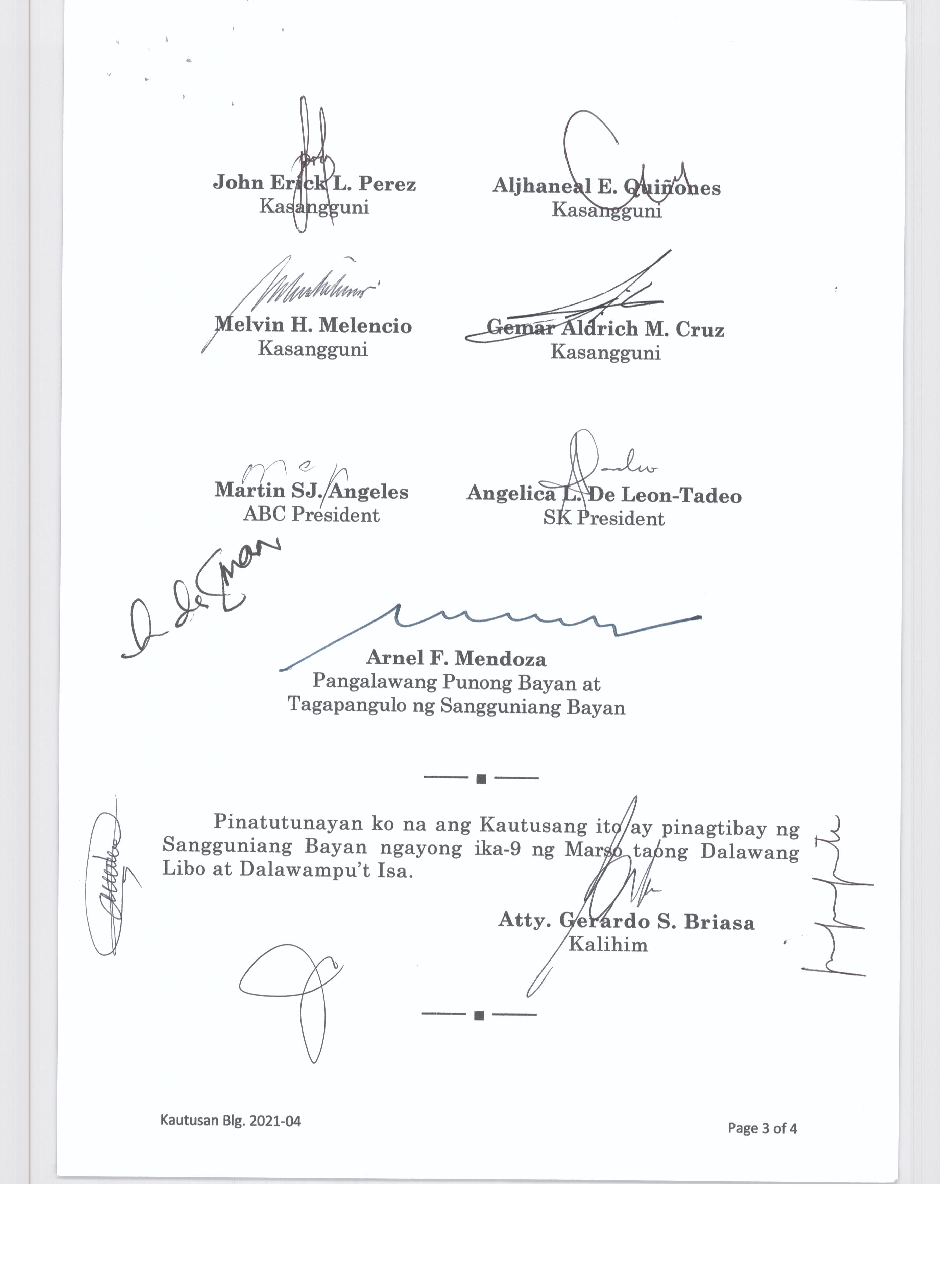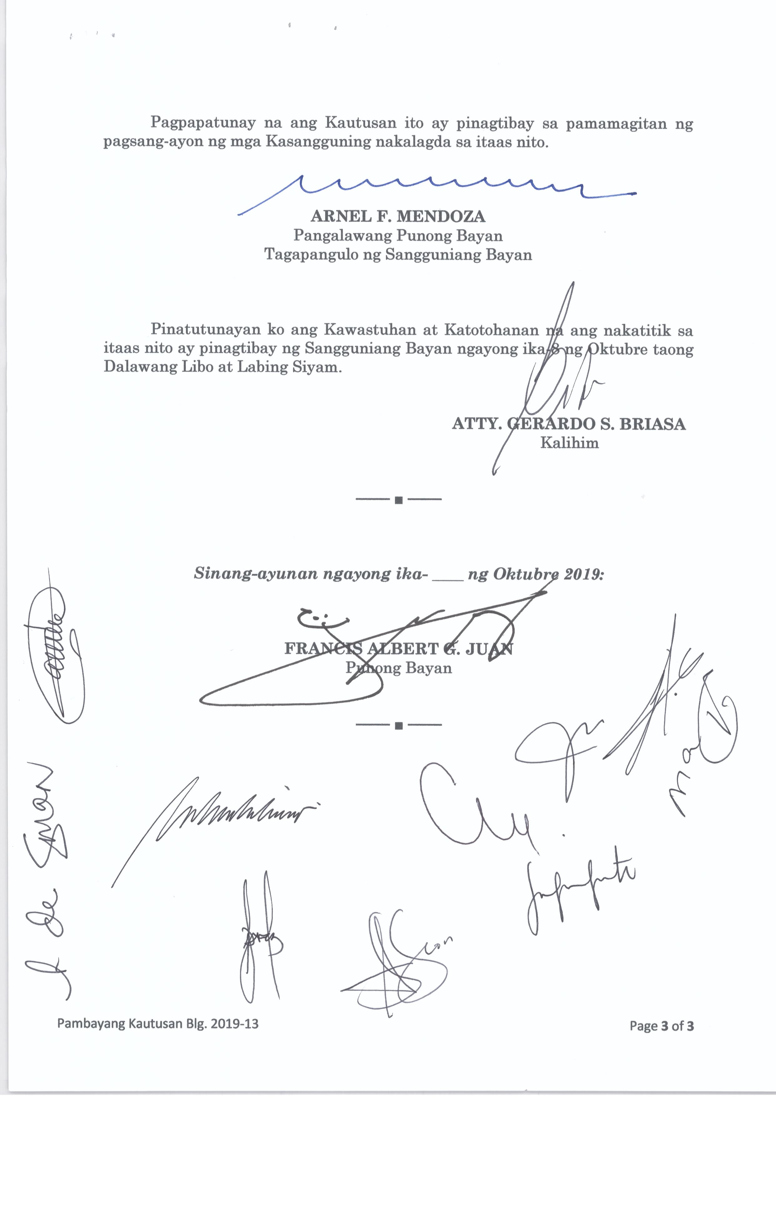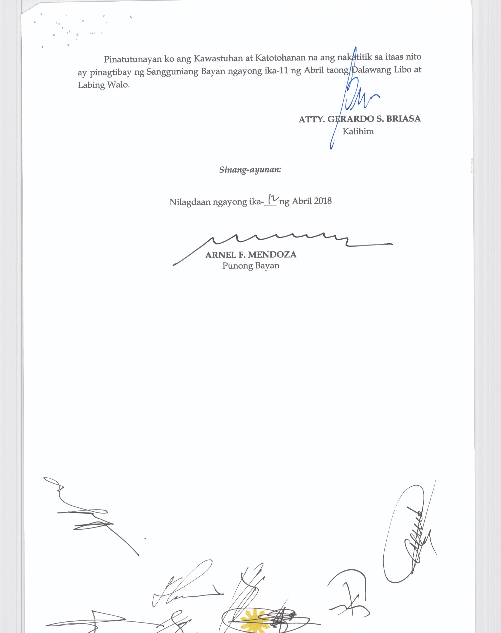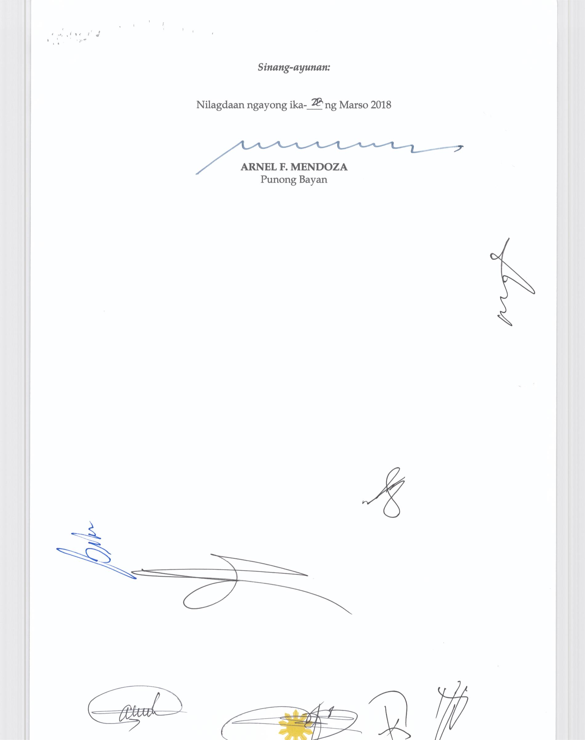 Isang Kautusang nagpapatibay sa Paglikha ng Posisyon ng Municipal risk Reduction and Management Officer lll na may salary Grade 18 (1) sa Ilalim ng Tanggapan ng Punong Bayan.