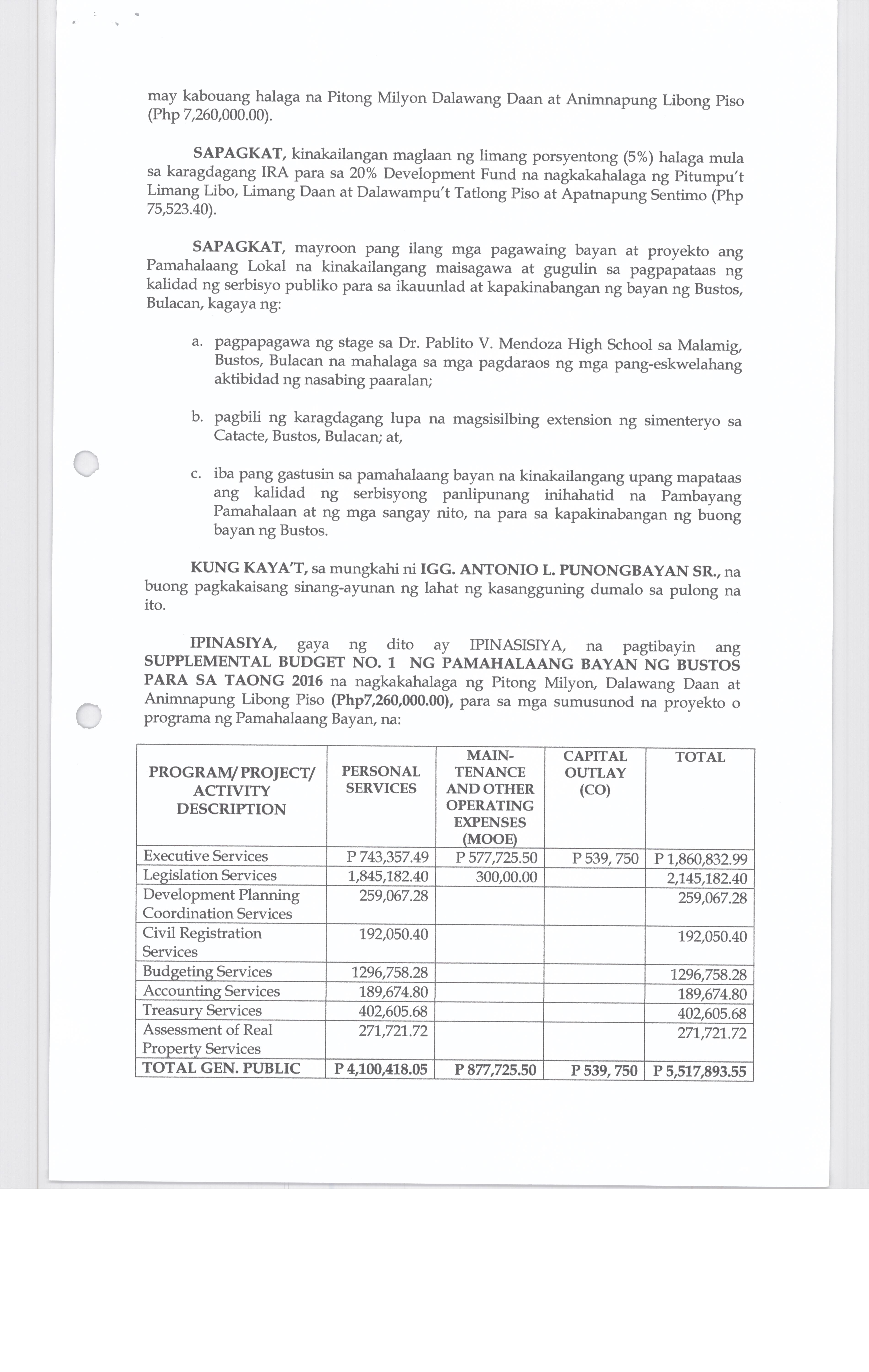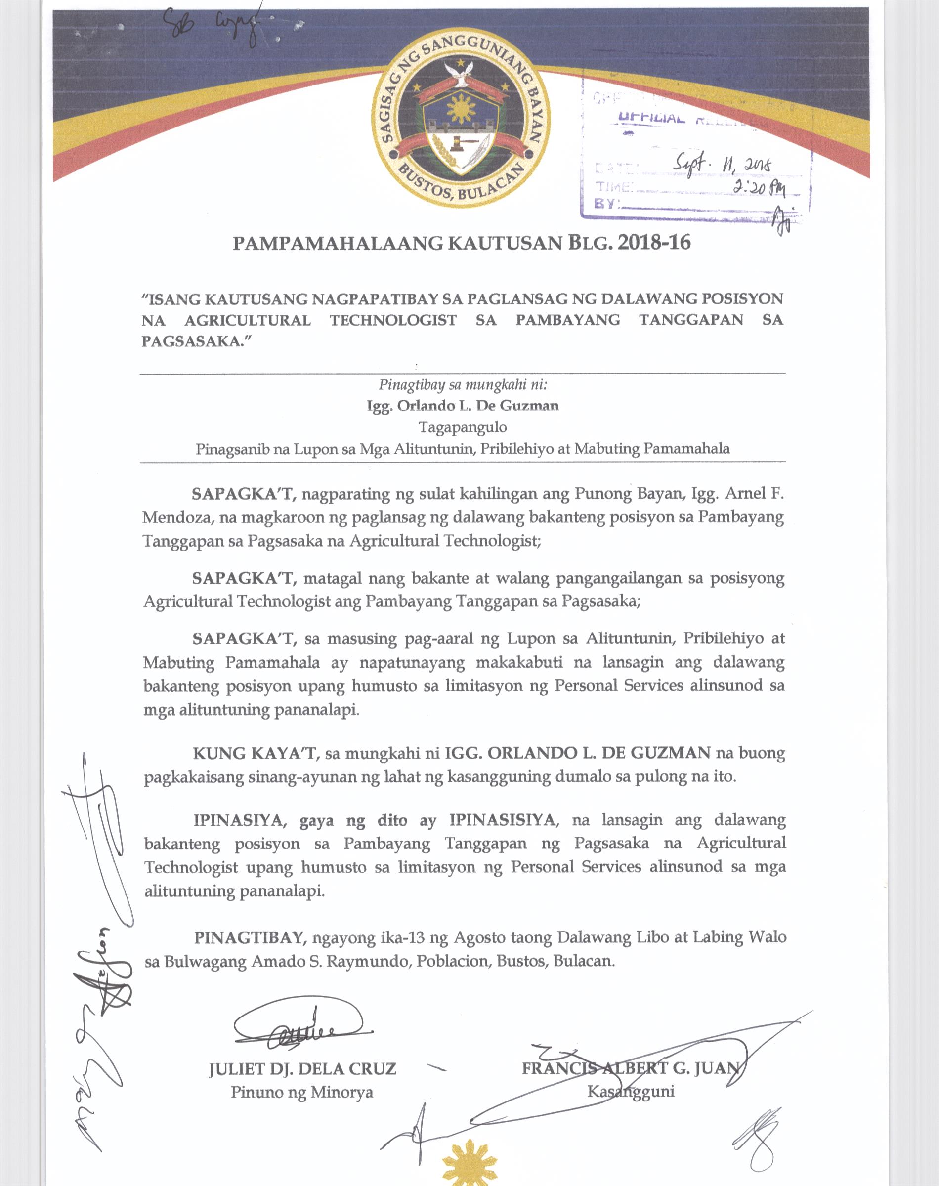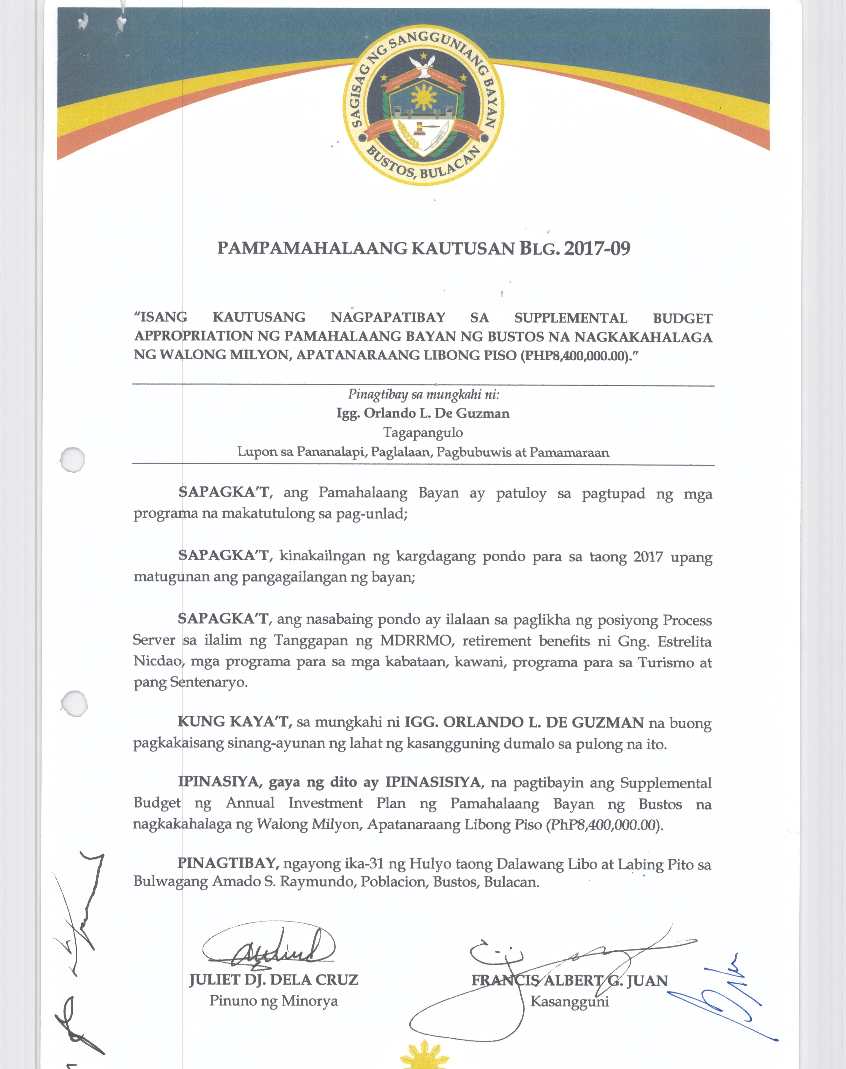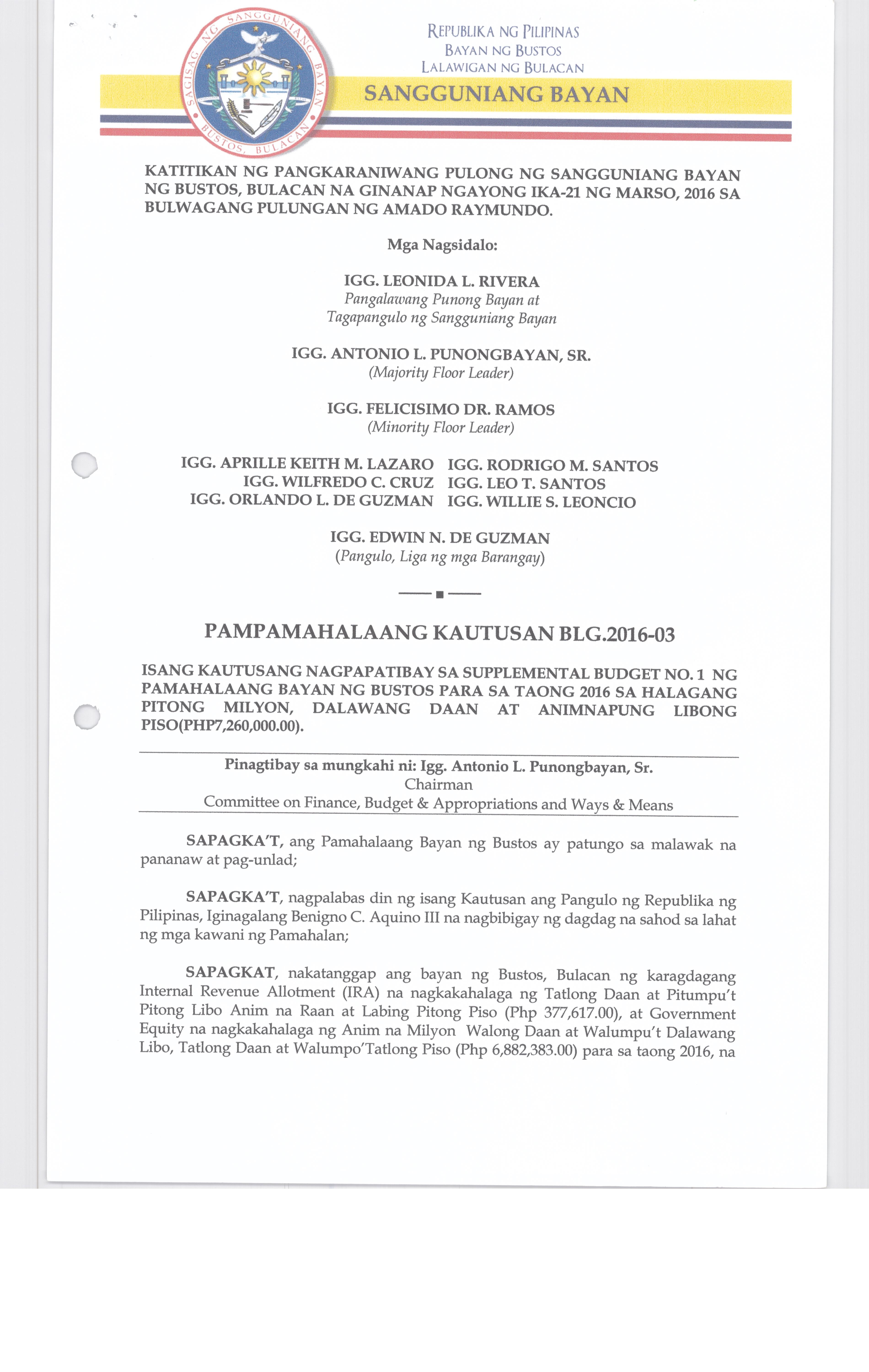 Isang Kautusan nagpapatibay sa Supplemental Budget No. 1 ng Pamahalaang Bayan ng Bustos para sa taong 2016 sa halagang Php.7,260,000.00.