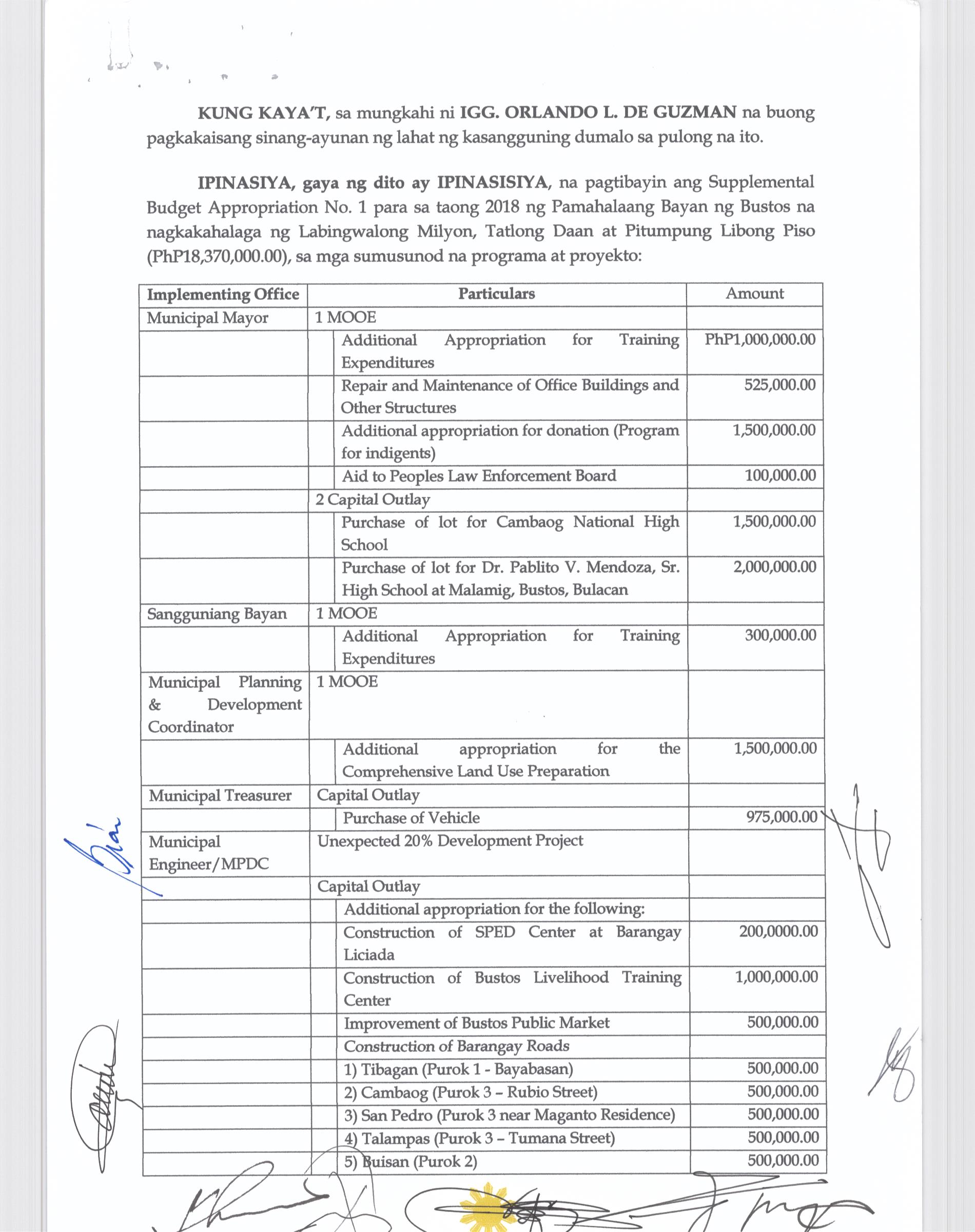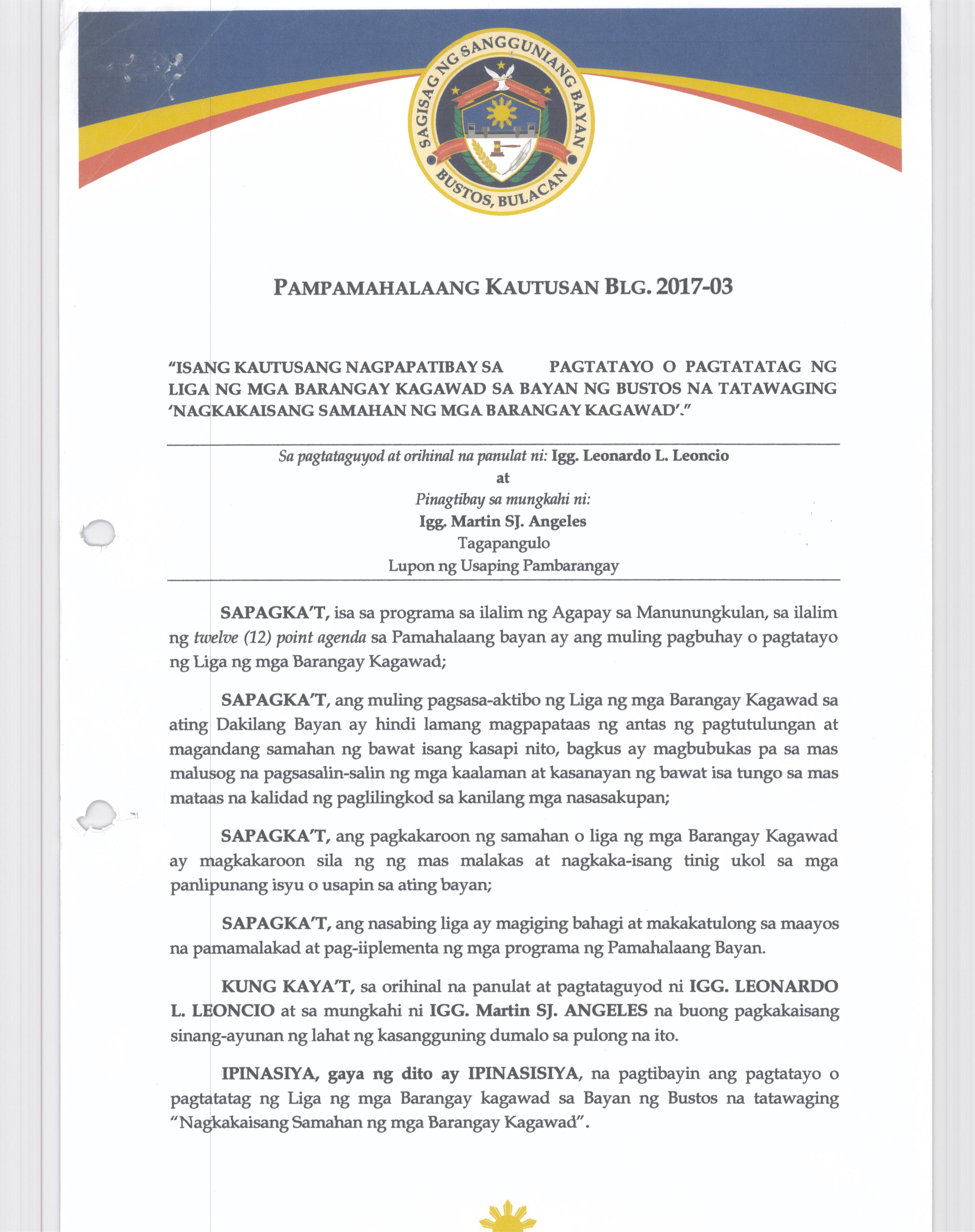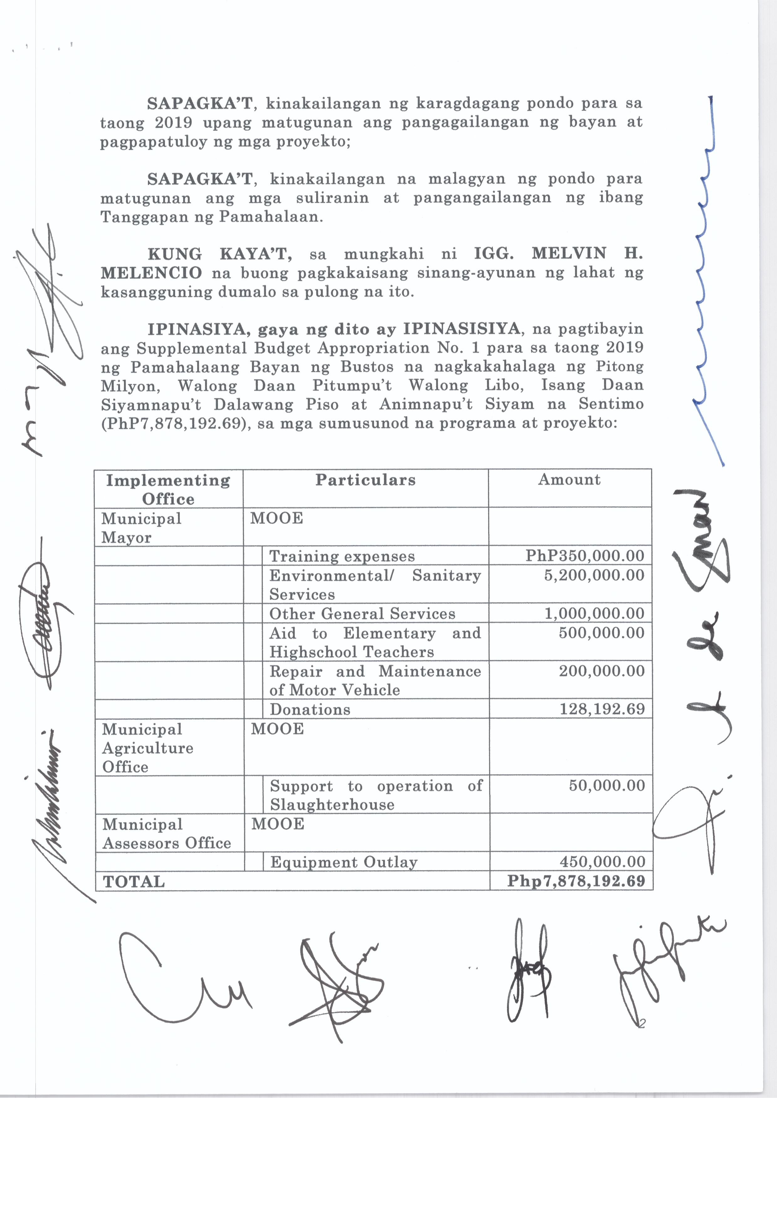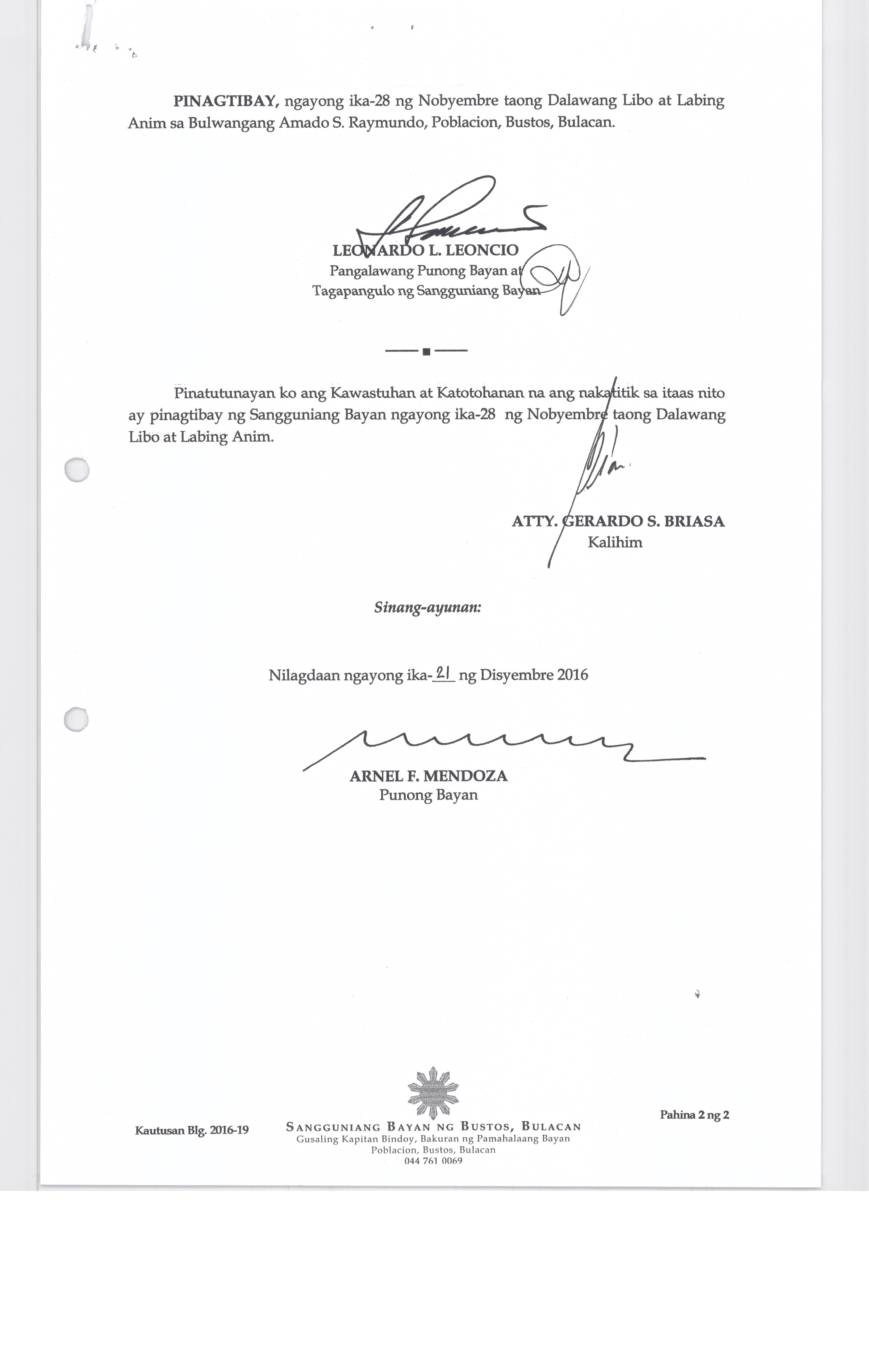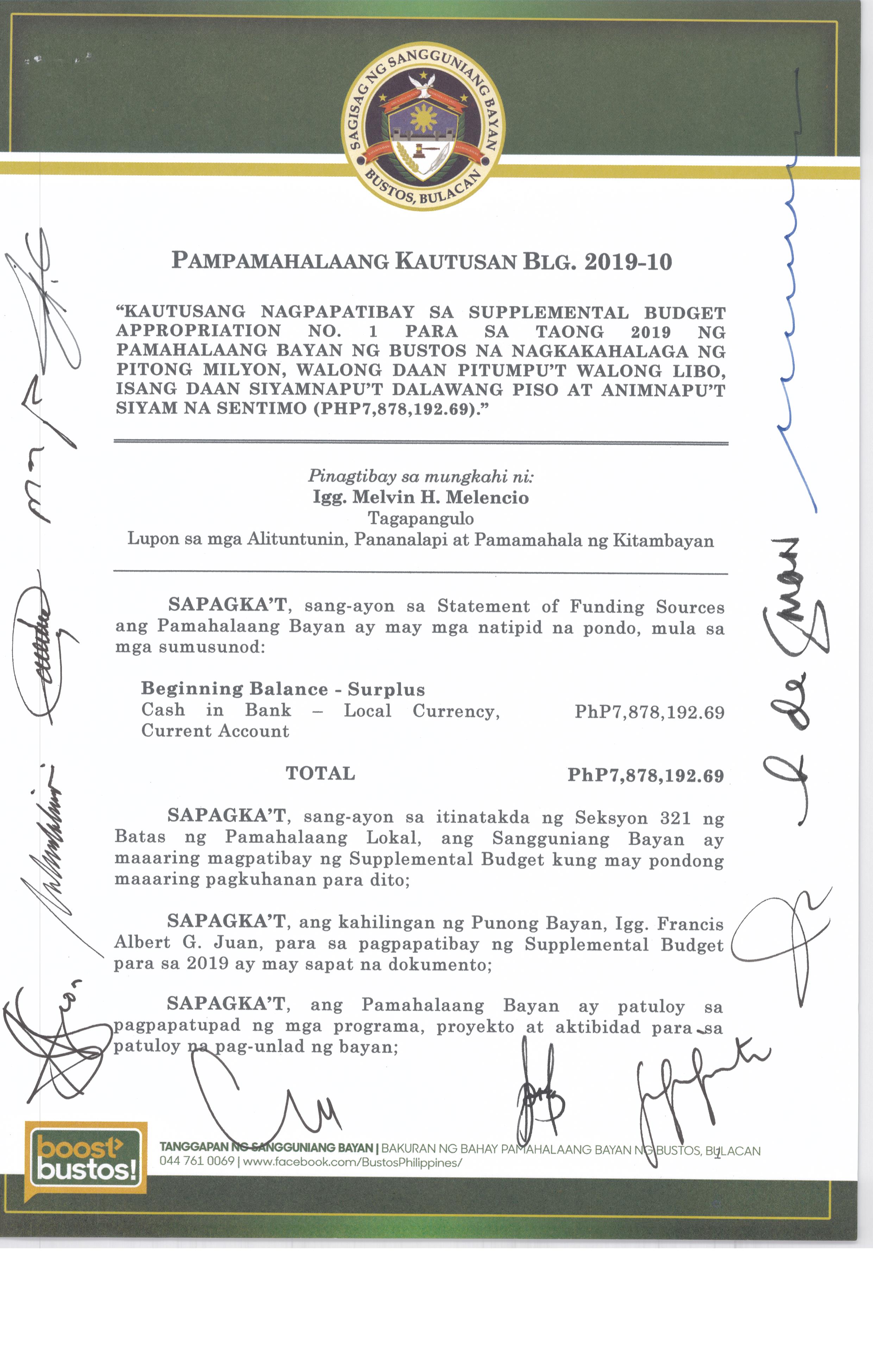 Isang Kautusan nagpapatibay sa Supplemental Budget No. 1 ng Pamahalaang Bayan ng Bustos para sa taong 2016 sa halagang Php.7,260,000.00.