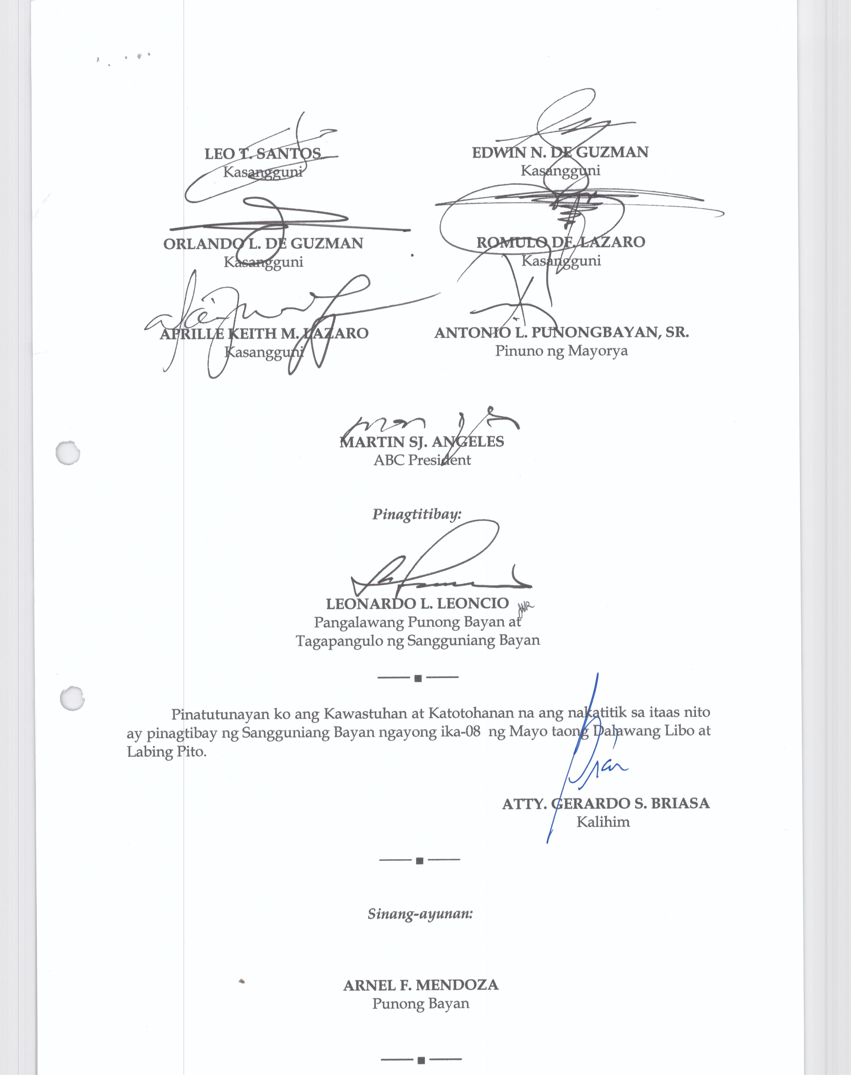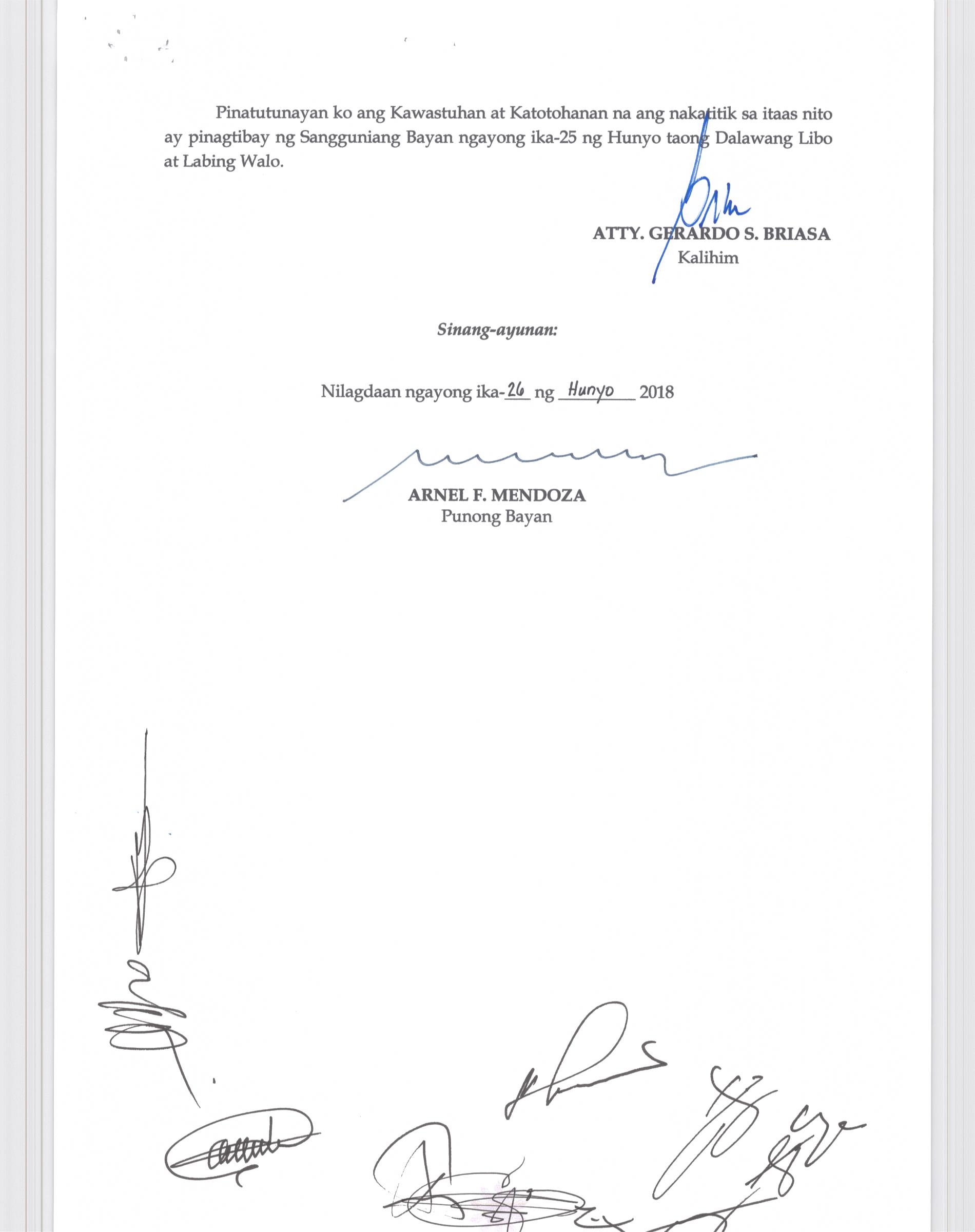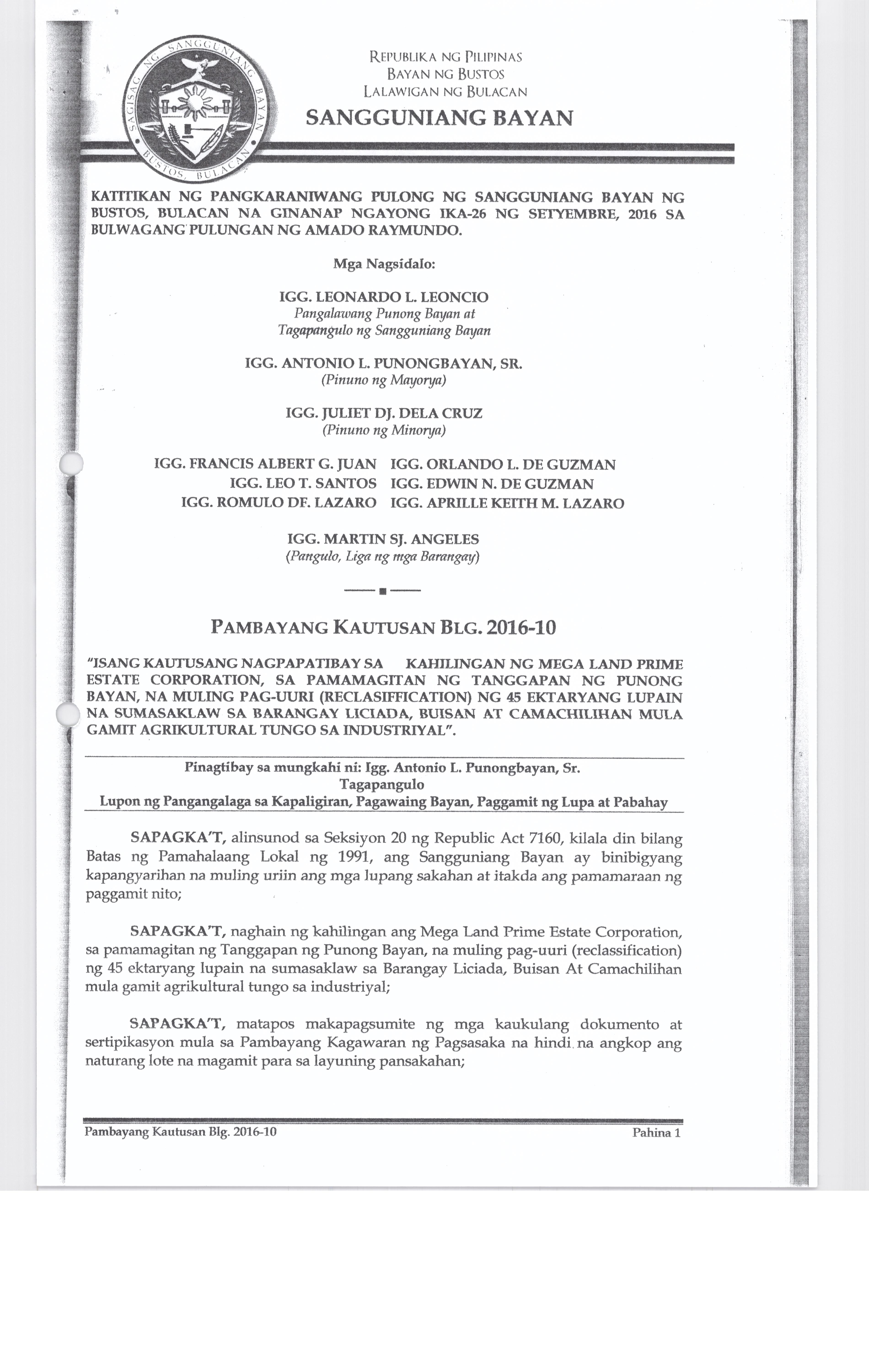 Isang kautusang nagpapatibay sa kahilingan ng Mega land Estate Corporation, sa pamamagitan ng Tanggapan ng Punong Bayan na muling pag-uuri (reclassification) ng 45 ektaryang lupain na sumasaklaw sa Barangay Liciada, Buisan at Camachilihan mula gamit agricultural tungo sa Industriyal.