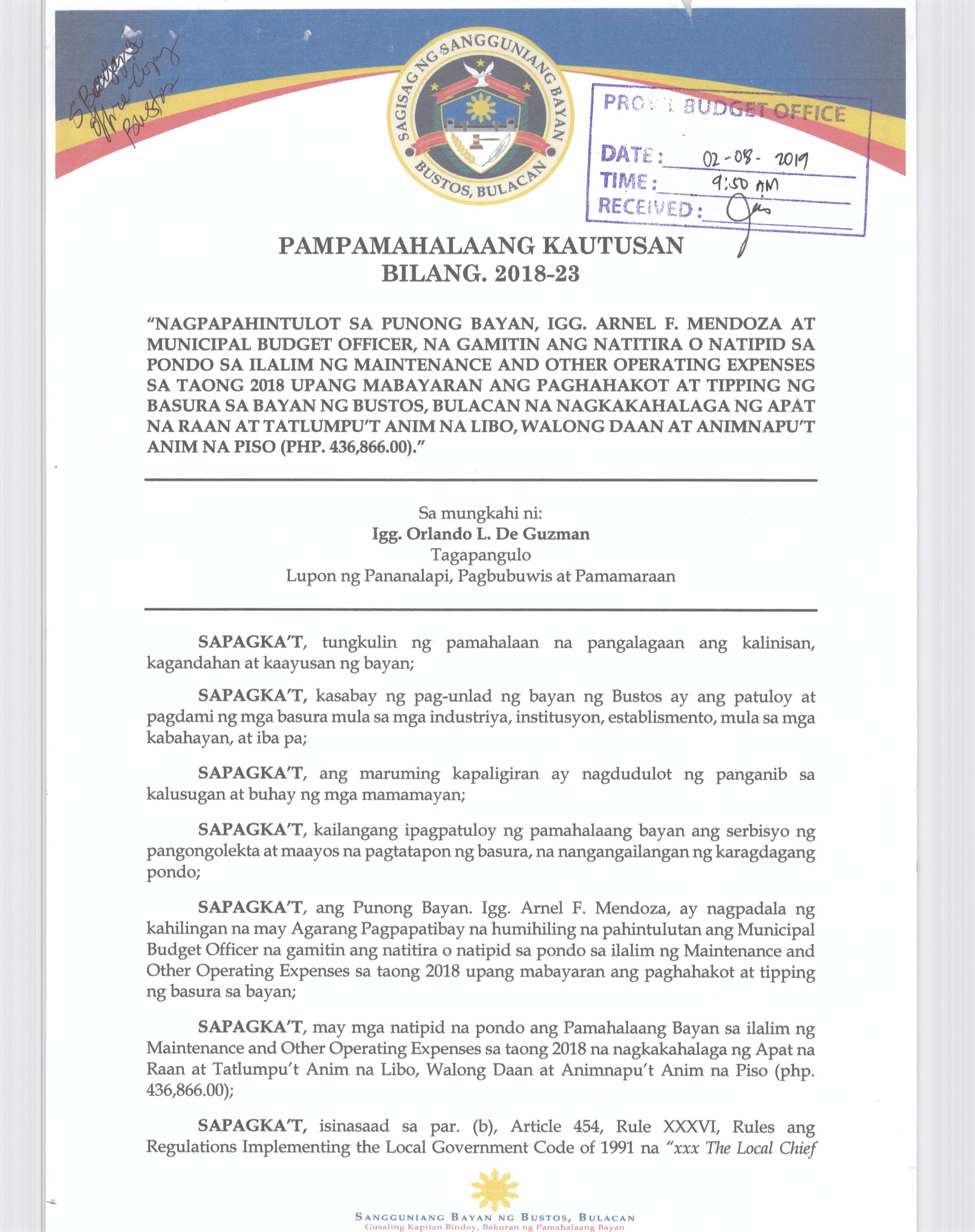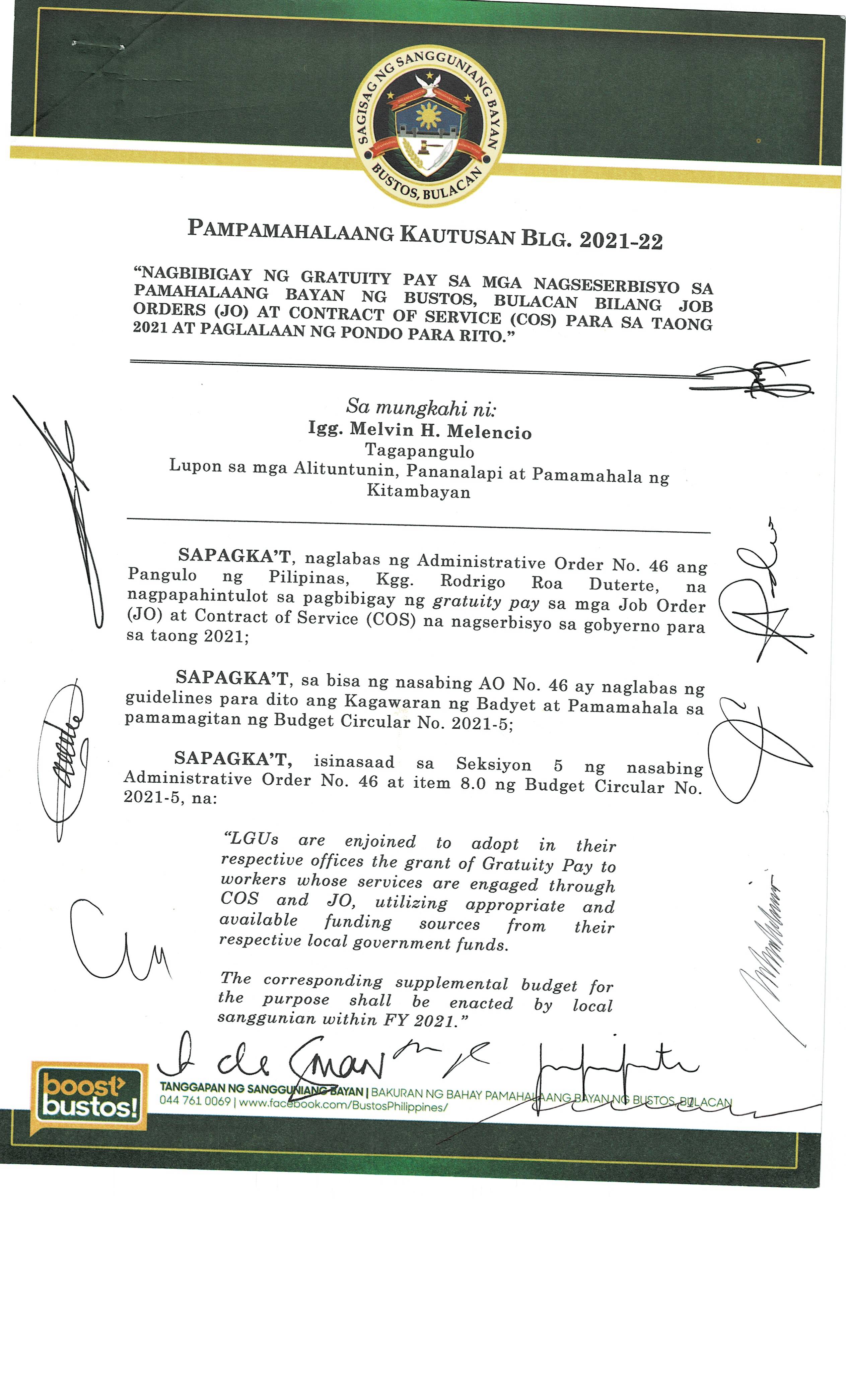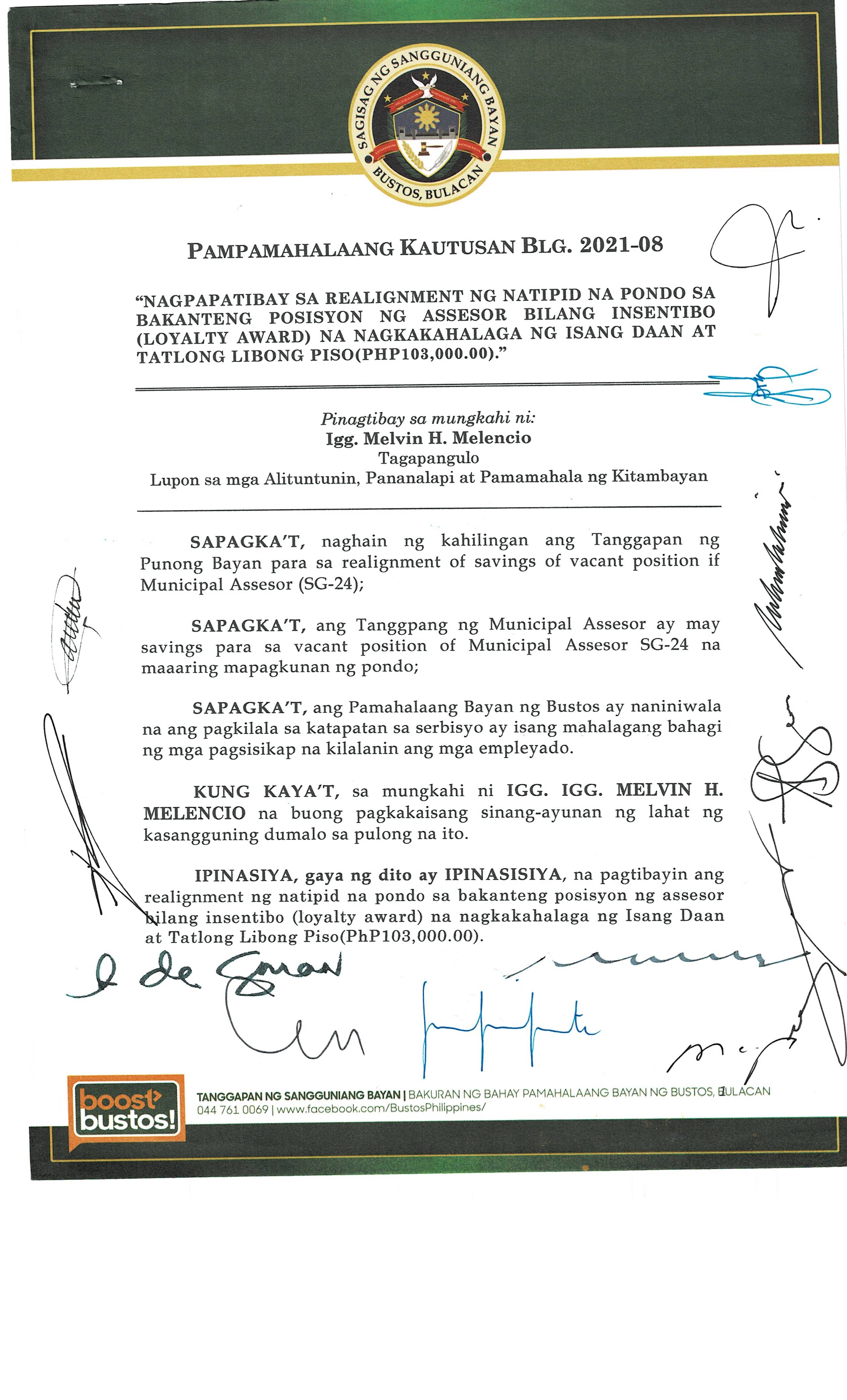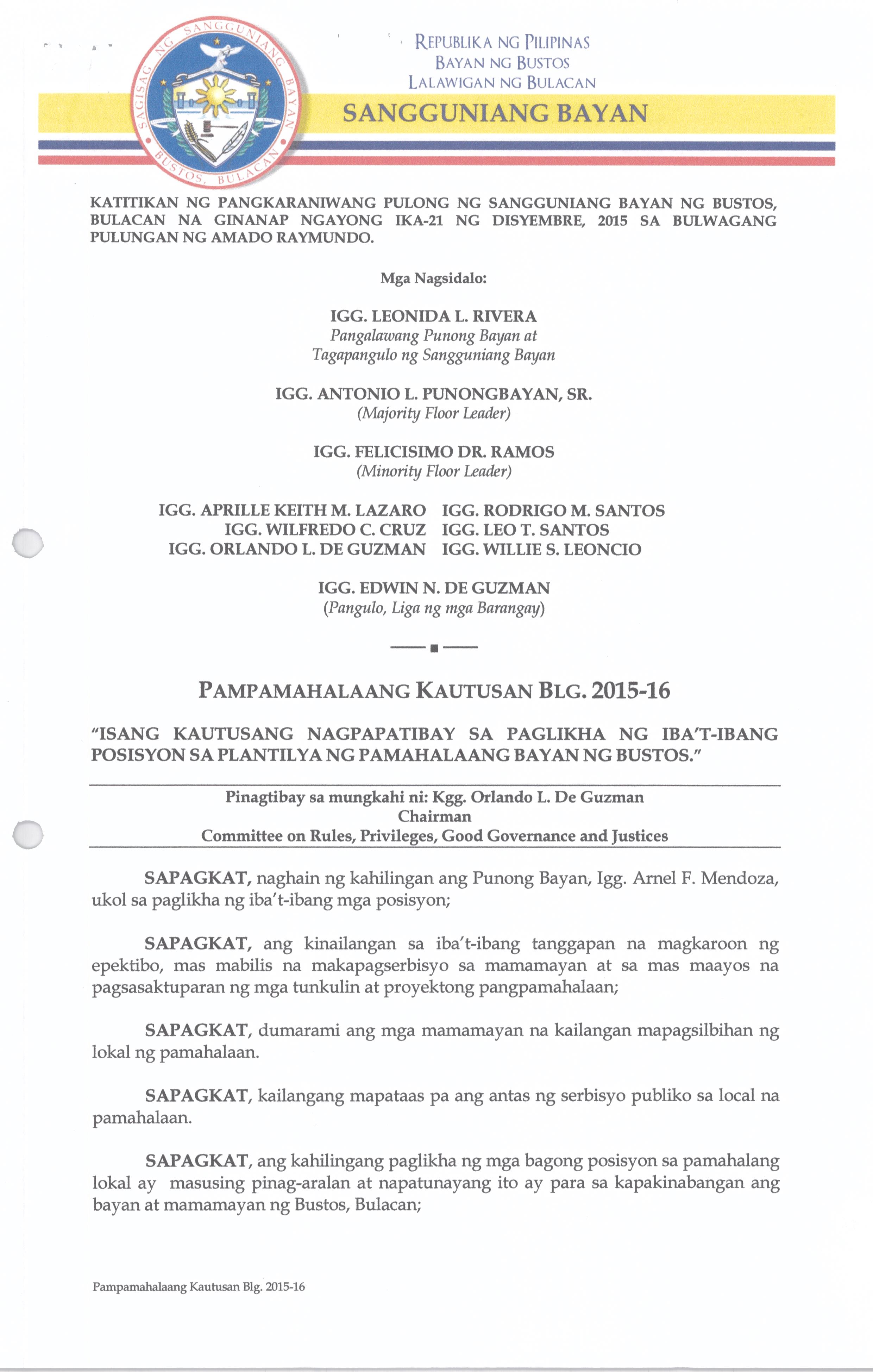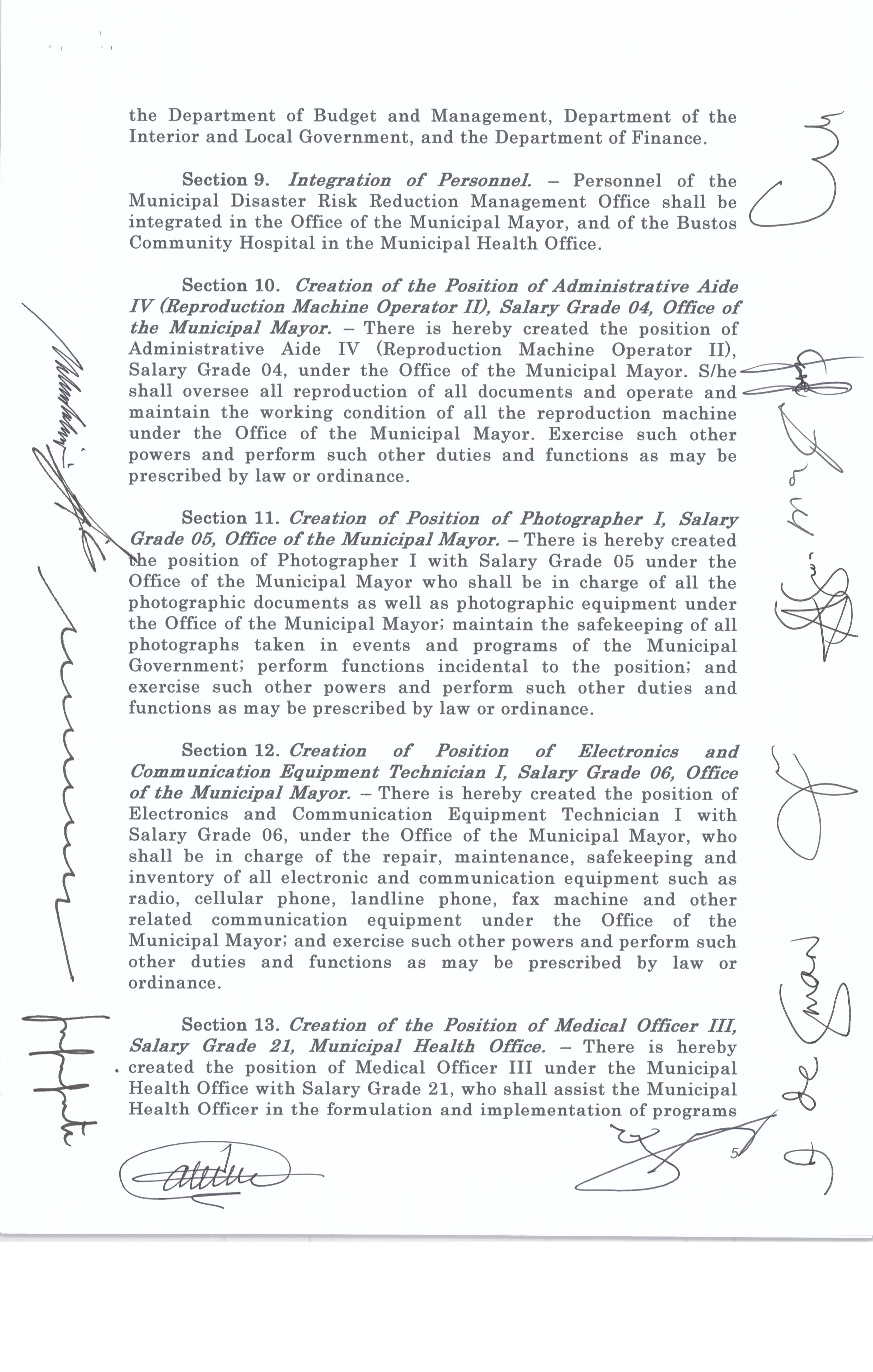 Isang Kautusang nagpapatibay sa Paglikha ng Iba’t-Ibang Posisyon sa Plantilya ng Pamahalaang Bayan ng Bustos.