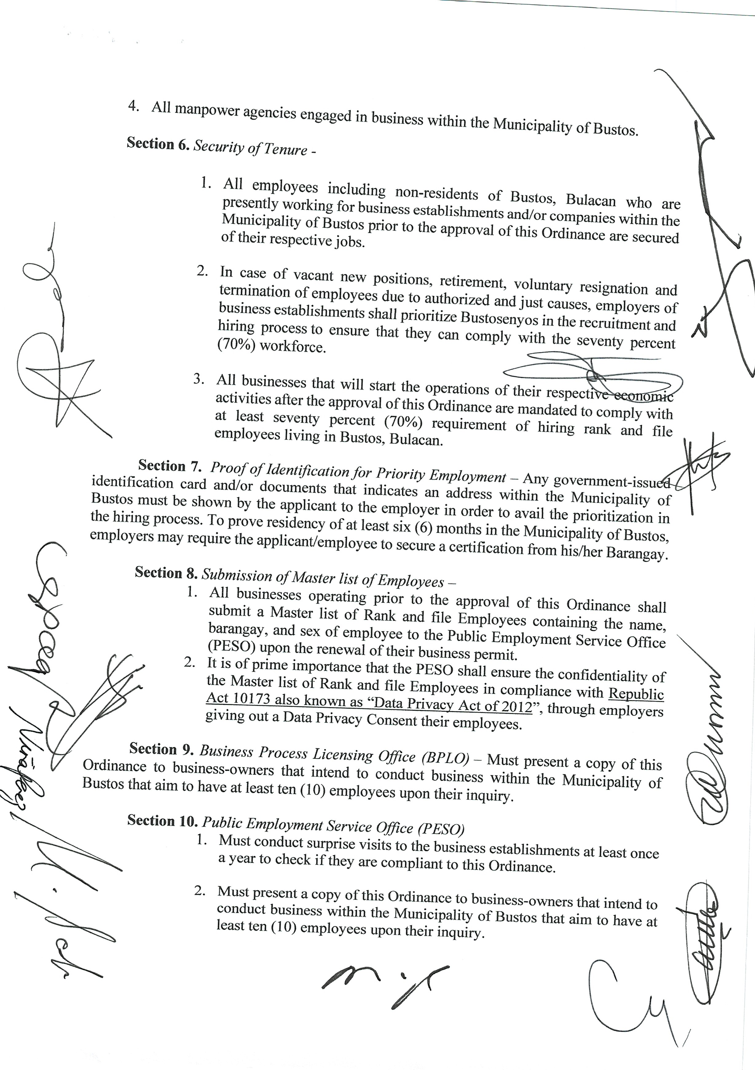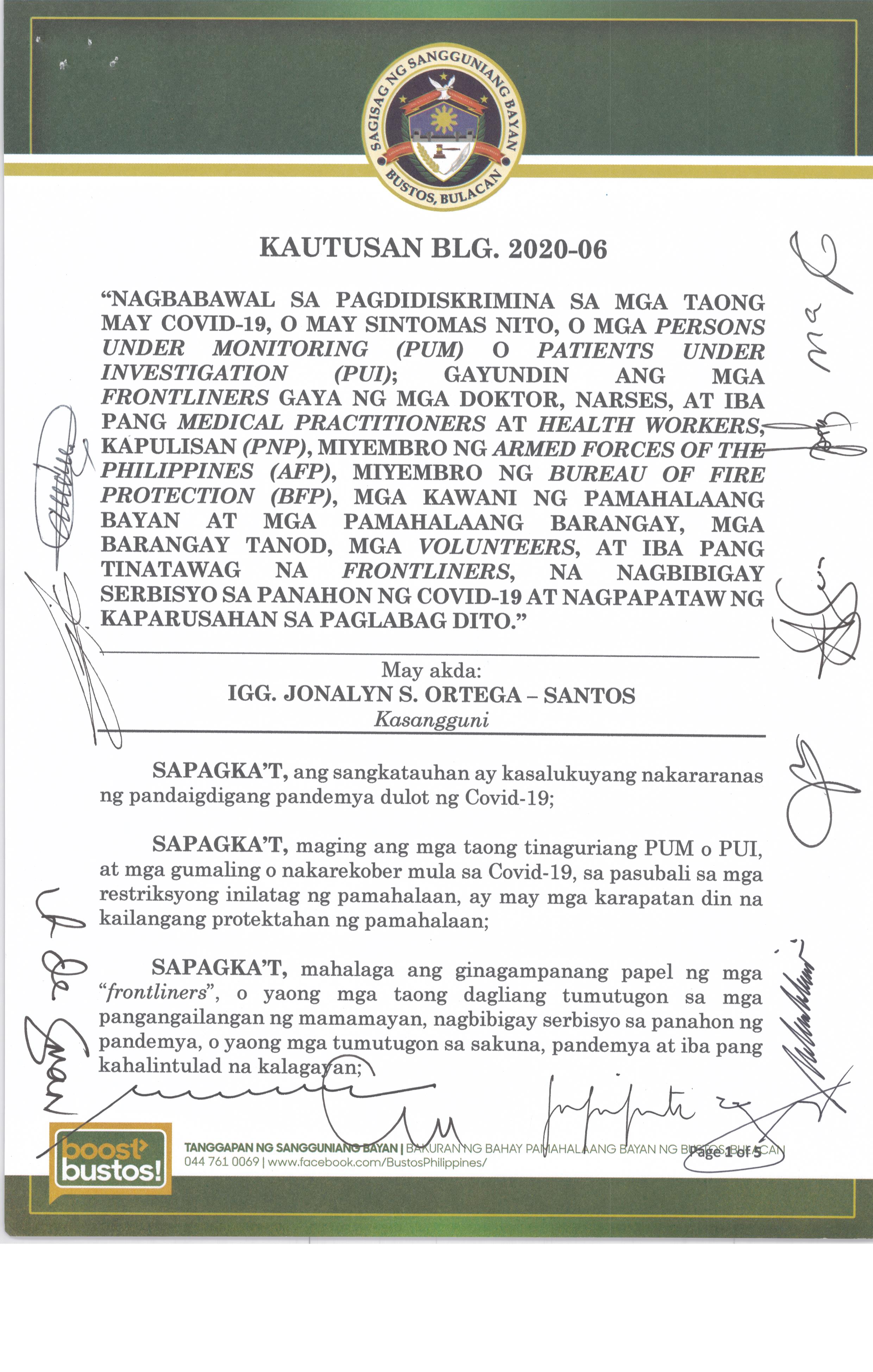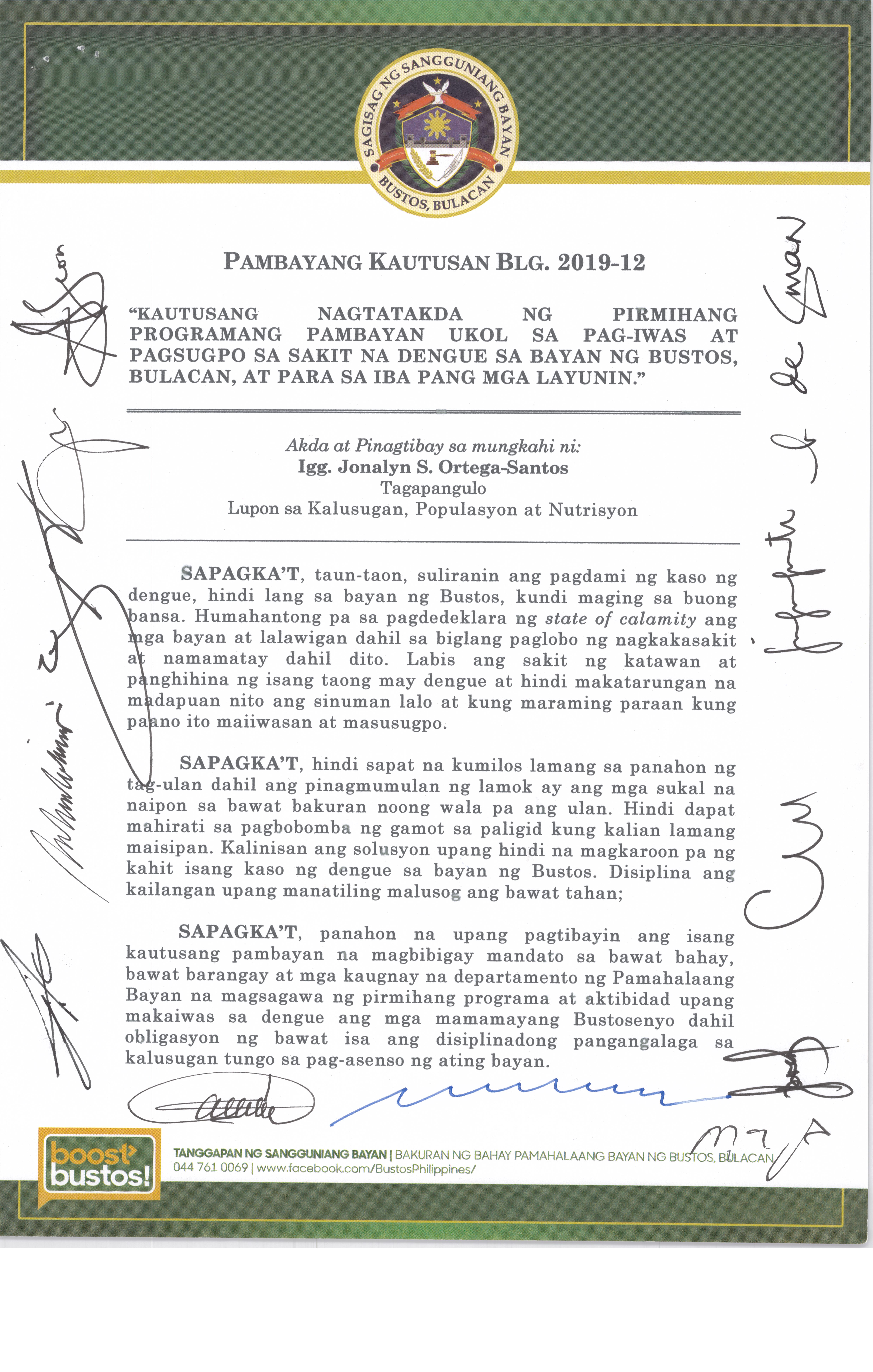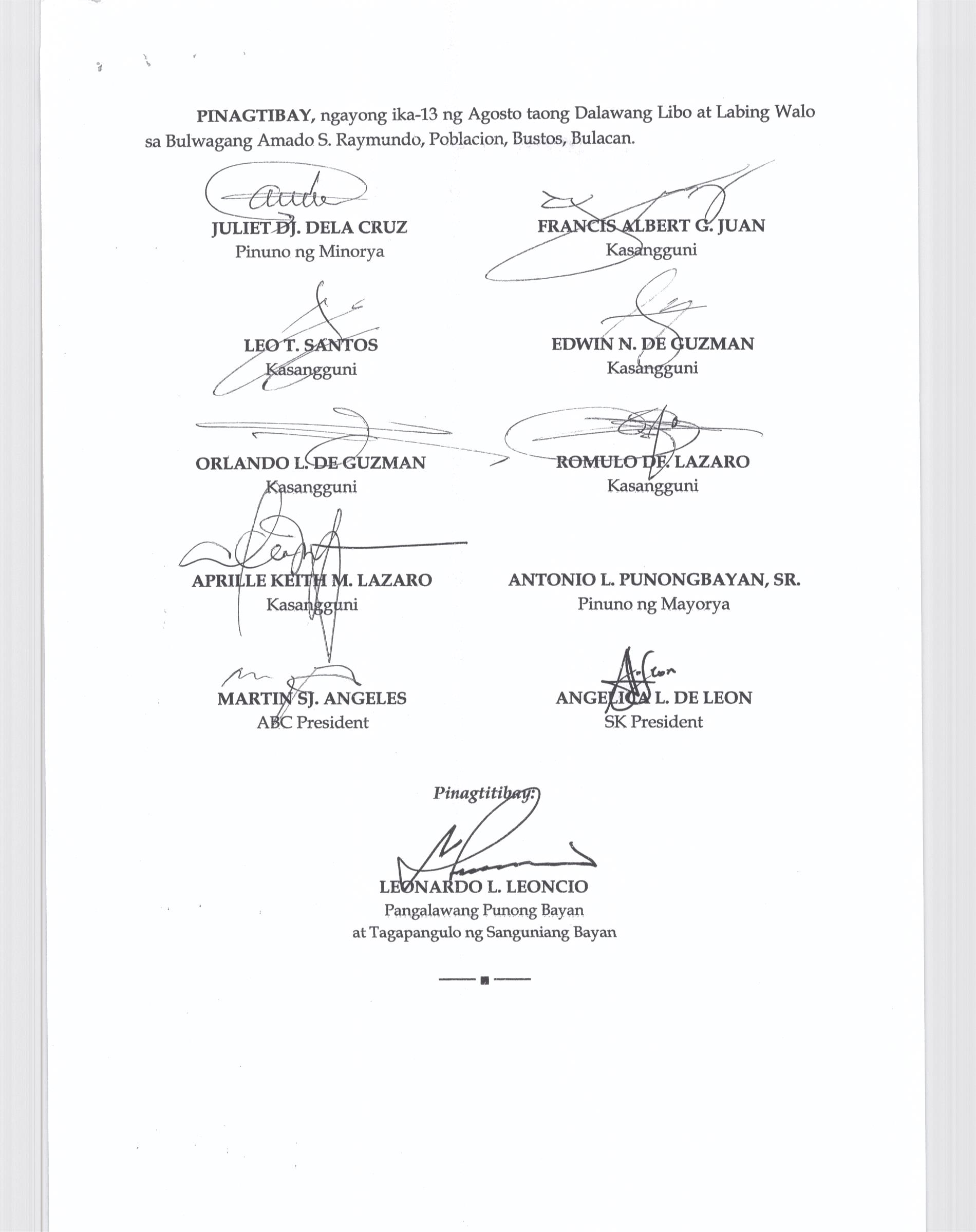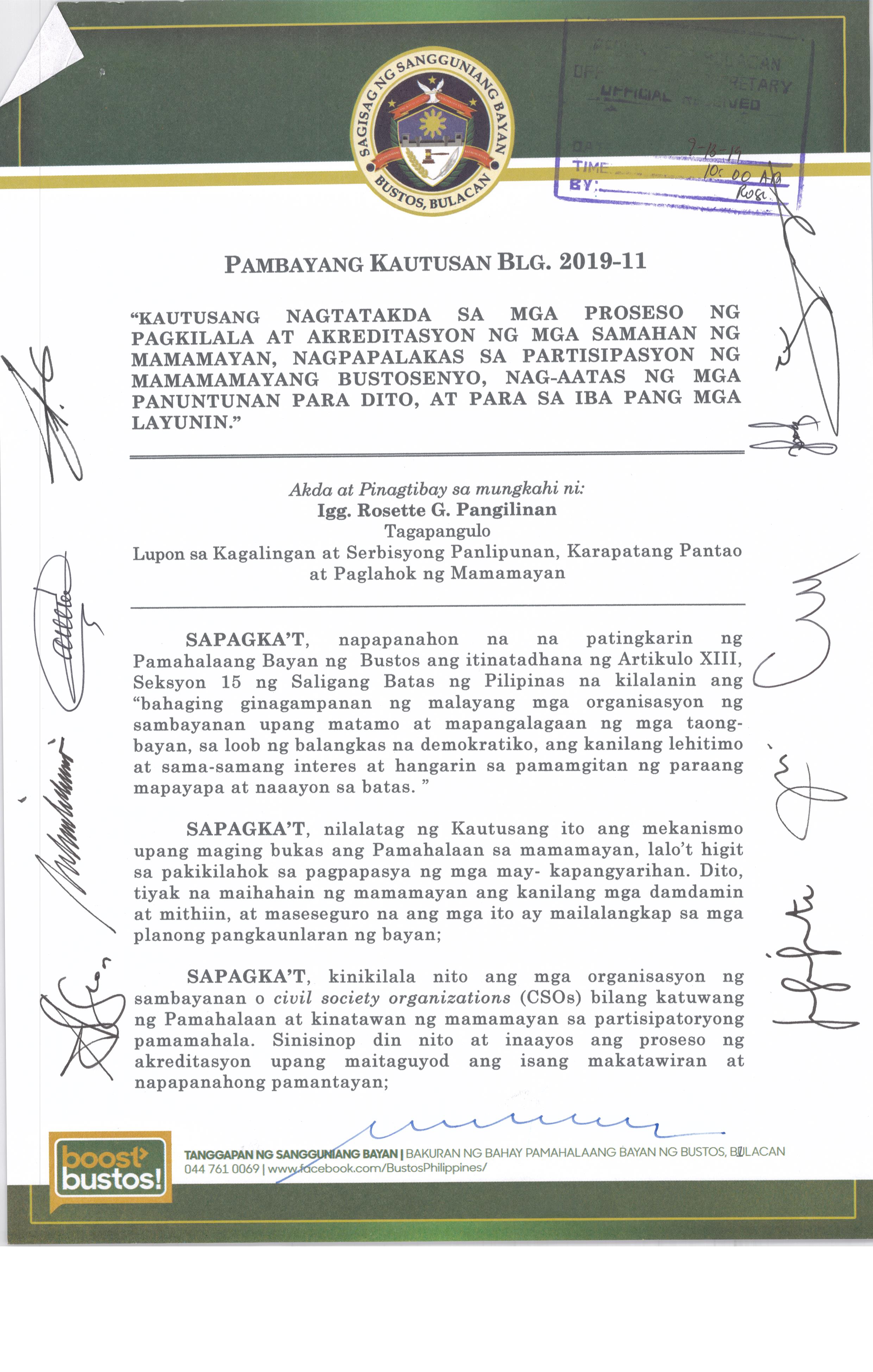 Isang Kautusang nagpapatibay sa Paglikha ng Iba’t-Ibang Posisyon sa Plantilya ng Pamahalaang Bayan ng Bustos.