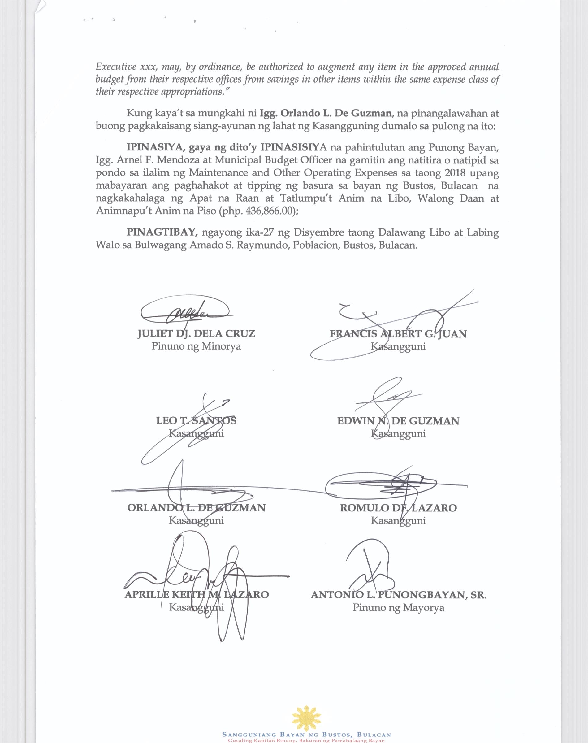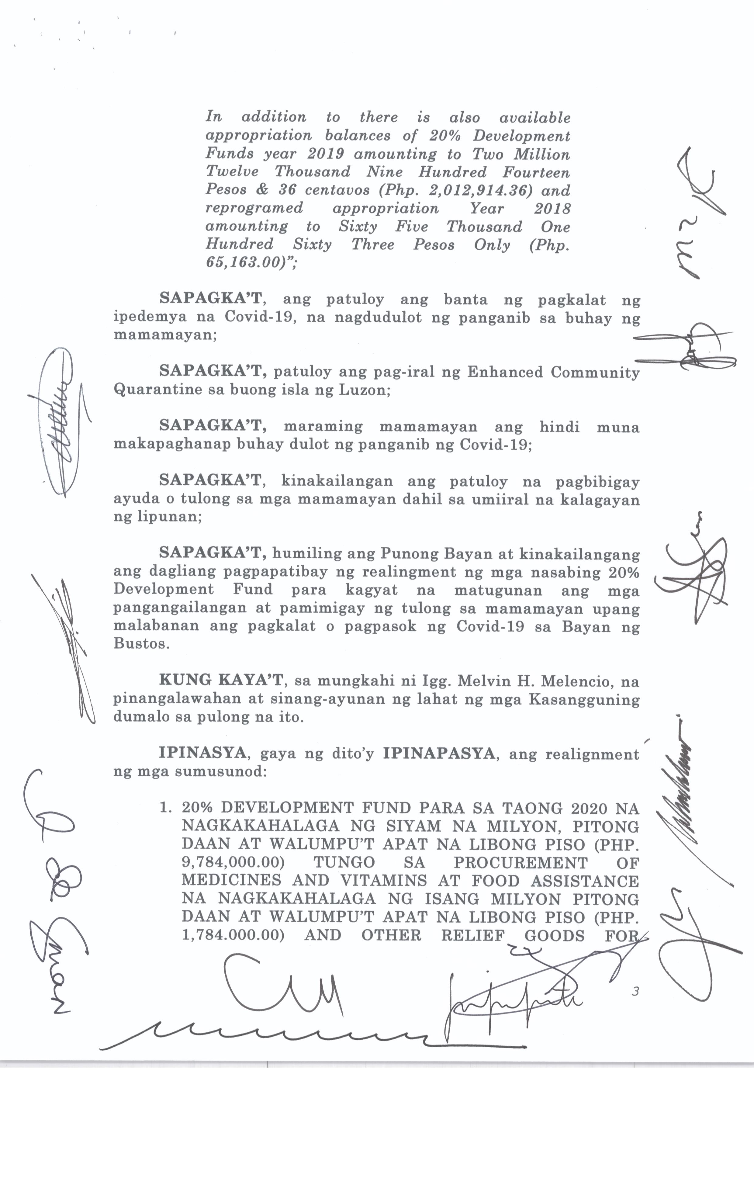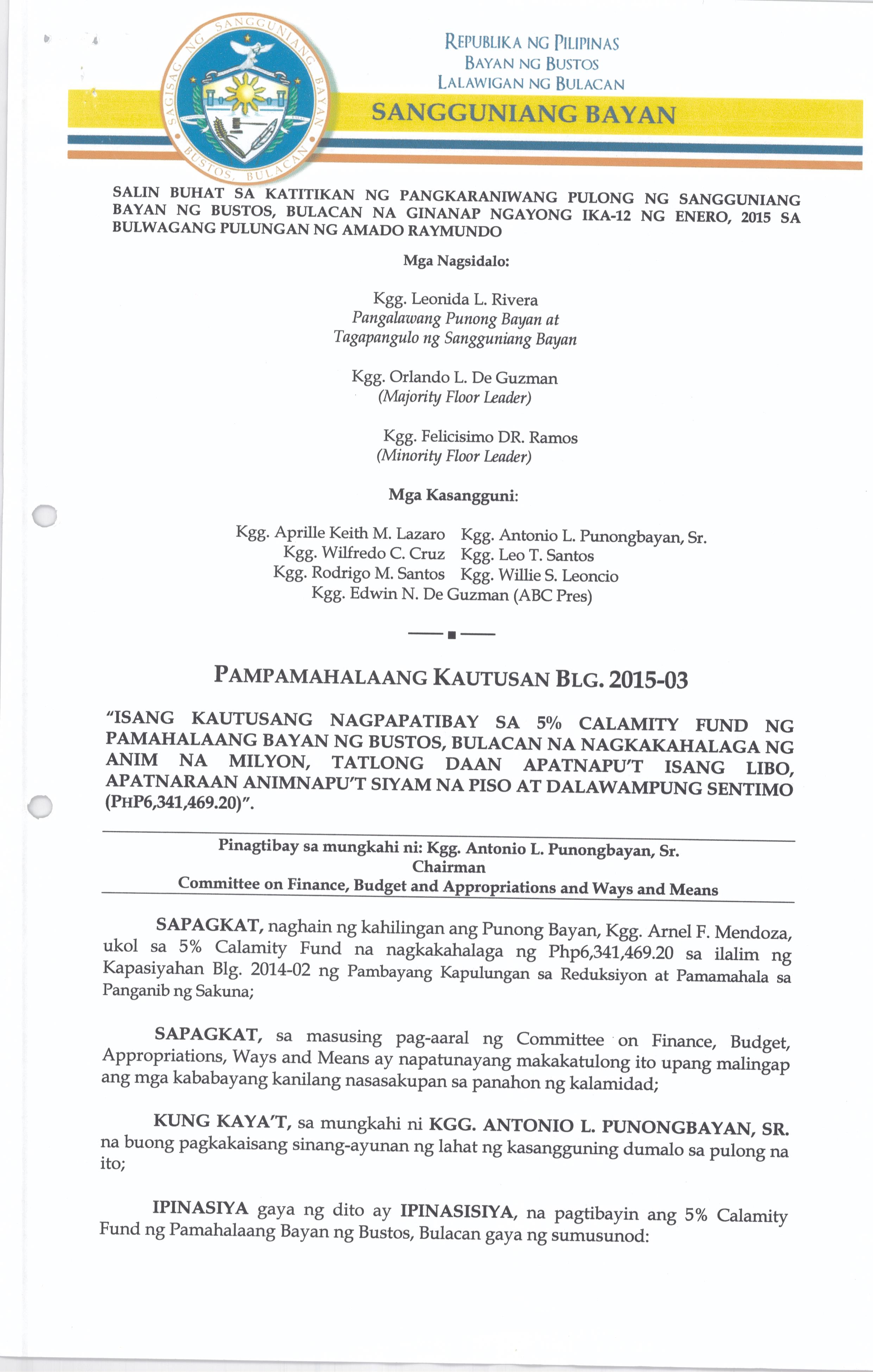 Isang Kautusang Nagpapatibay sa 5% Calamity Fund ng Pamahalaang Bayan ng Bustos Bulacan na nagkakahalaga ng Php.6,341,469.20