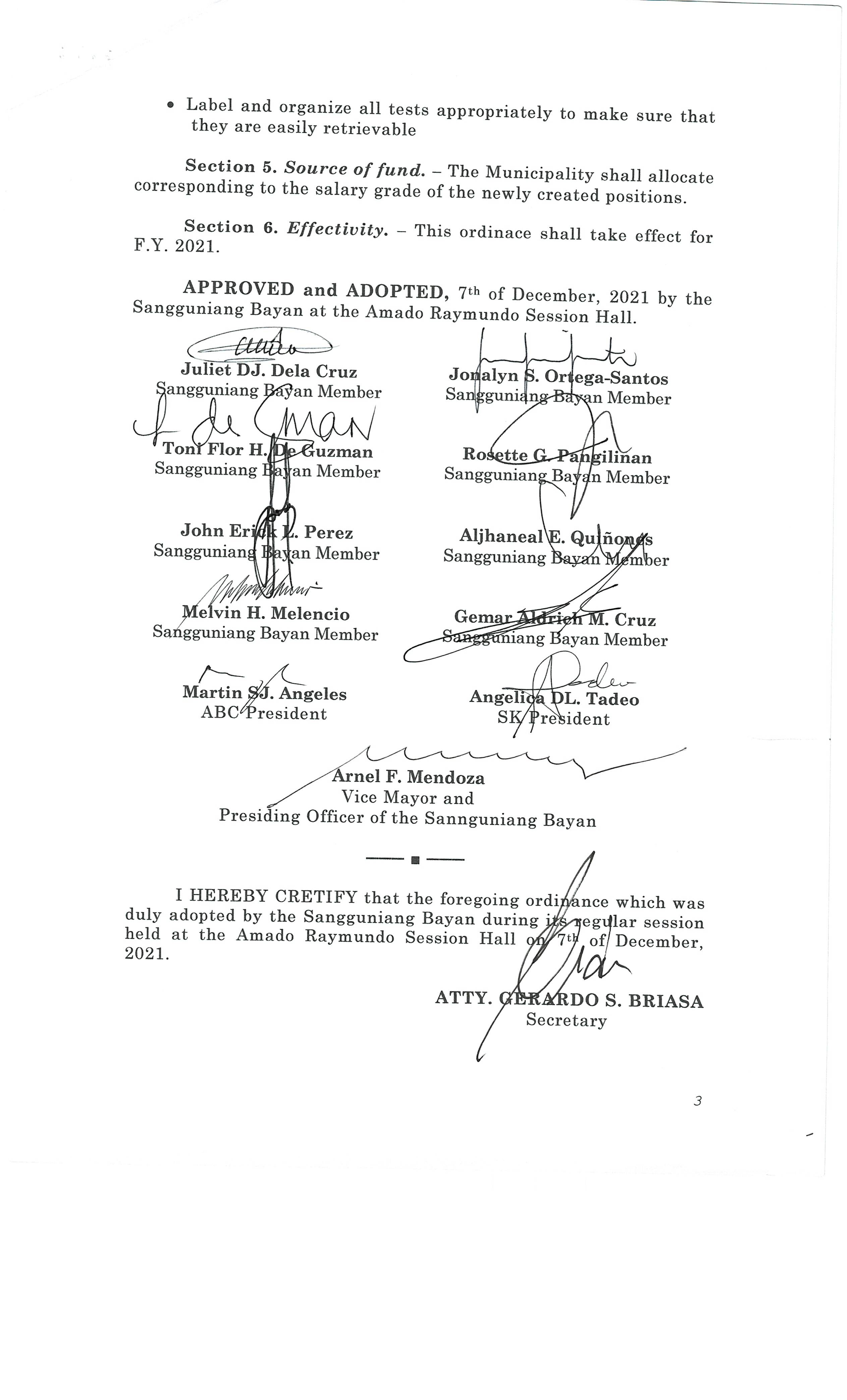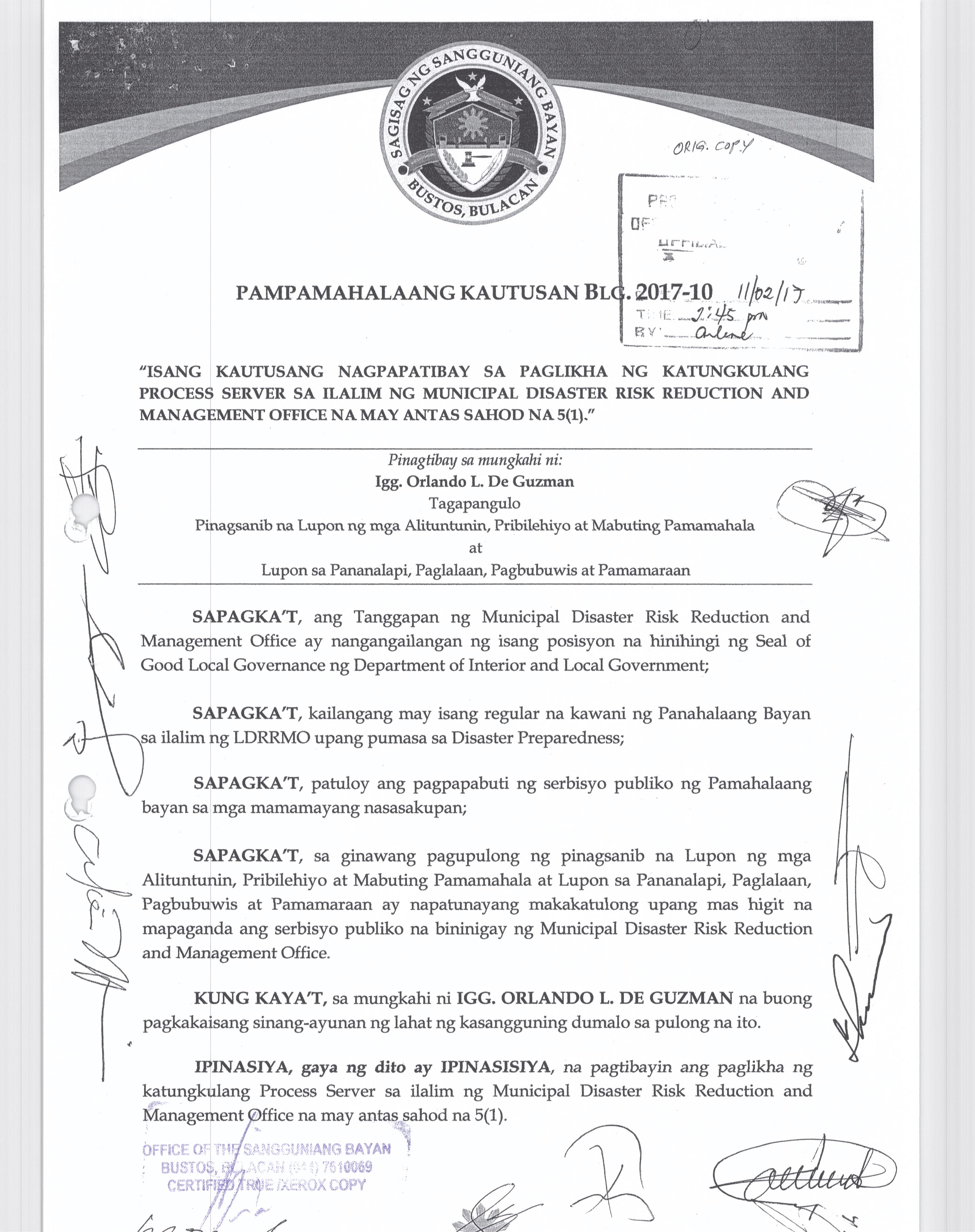 Isang Kautusang nagpapatibay sa Paglikha ng Posisyon ng Municipal risk Reduction and Management Officer lll na may salary Grade 18 (1) sa Ilalim ng Ta...