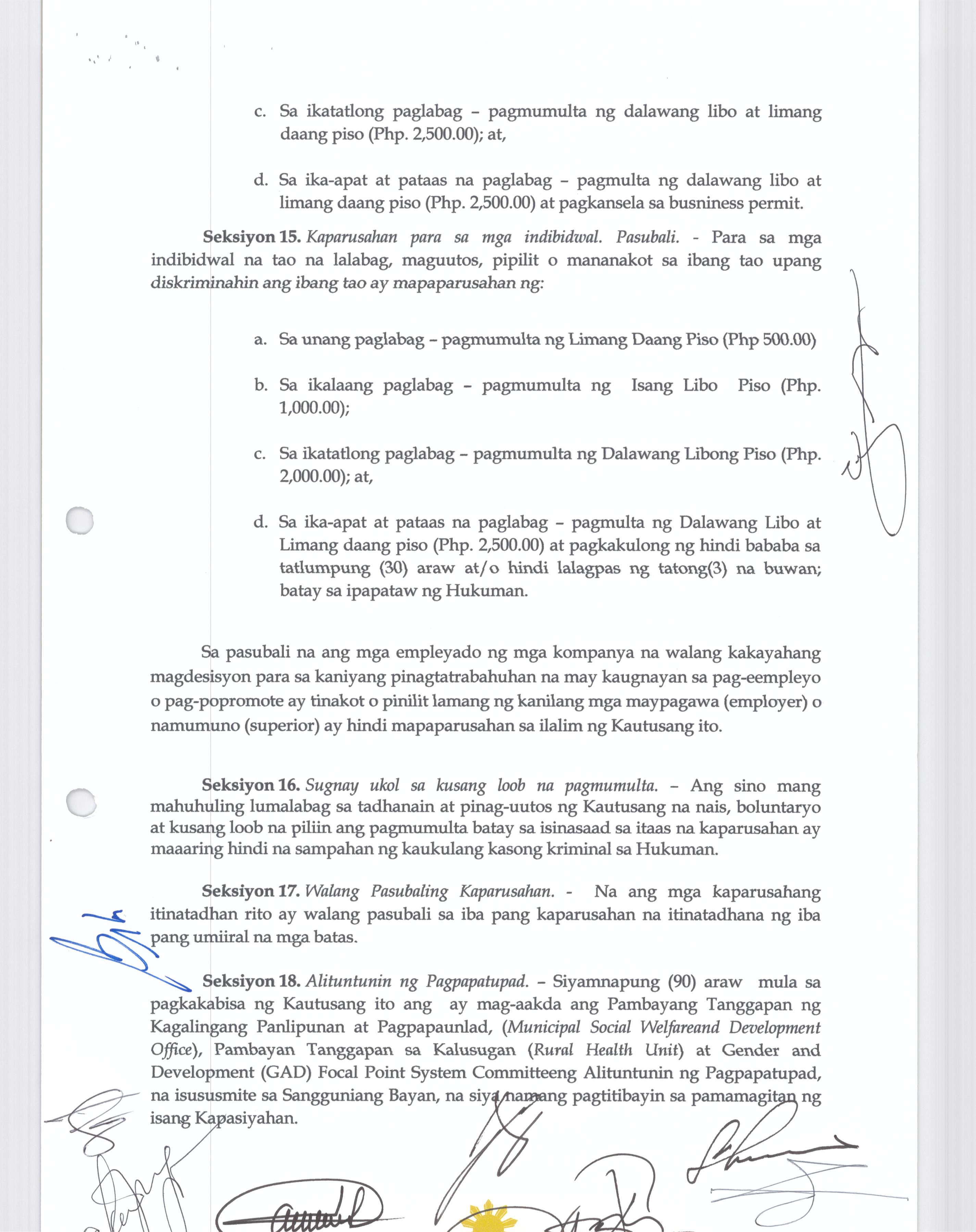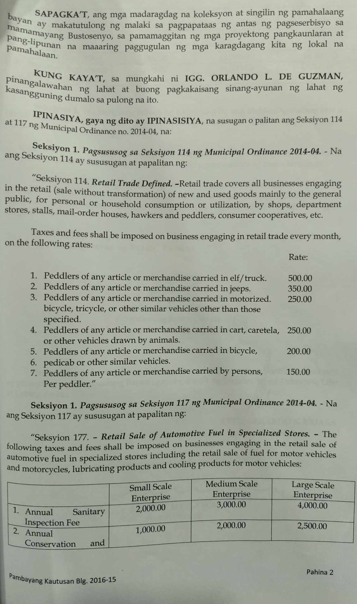 Isang Kautusang Nagpapatibay sa Pagsususog sa Seksiyon 114 at 117 ng Municipal Ordinance No. 2014-004.