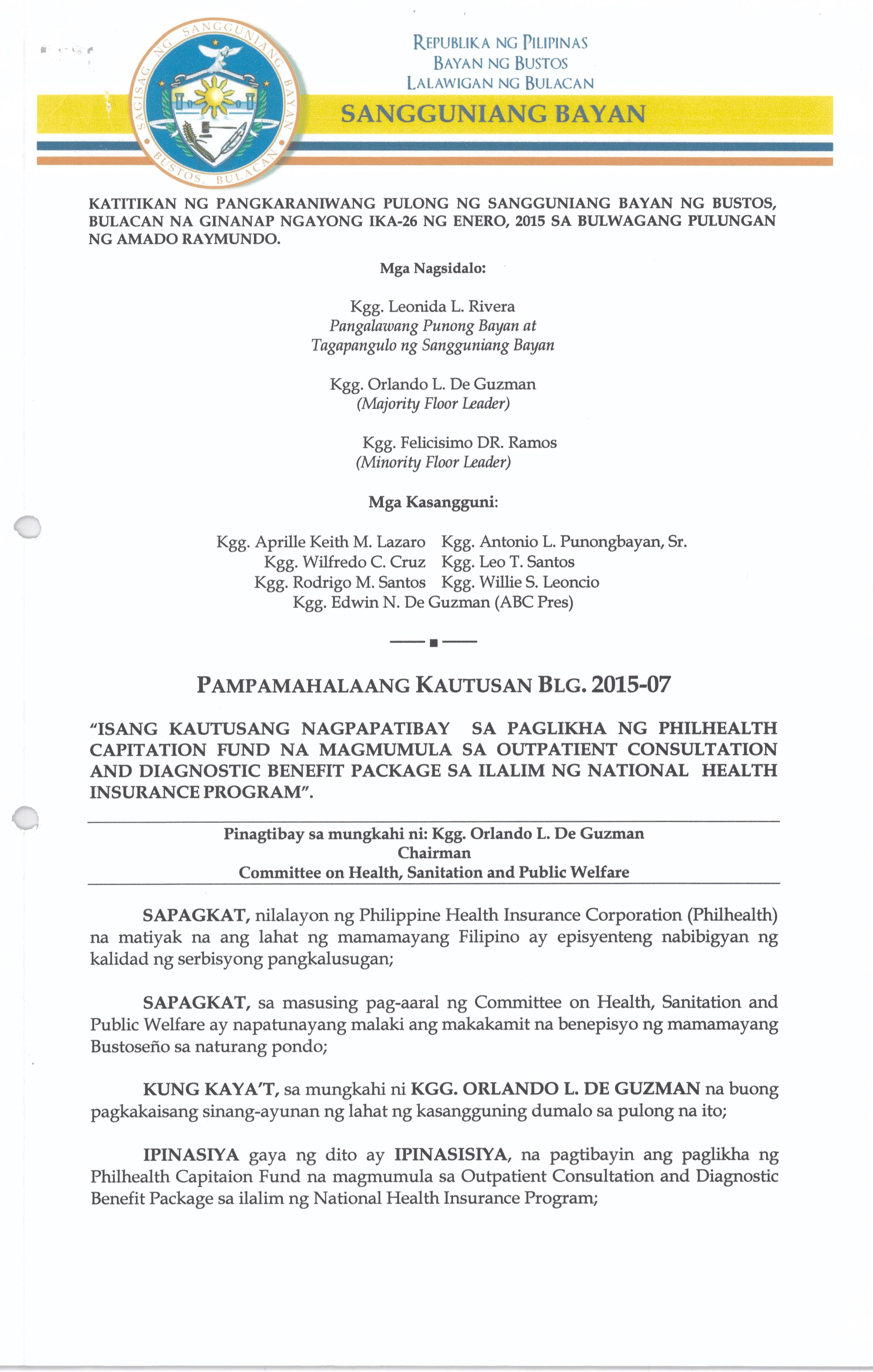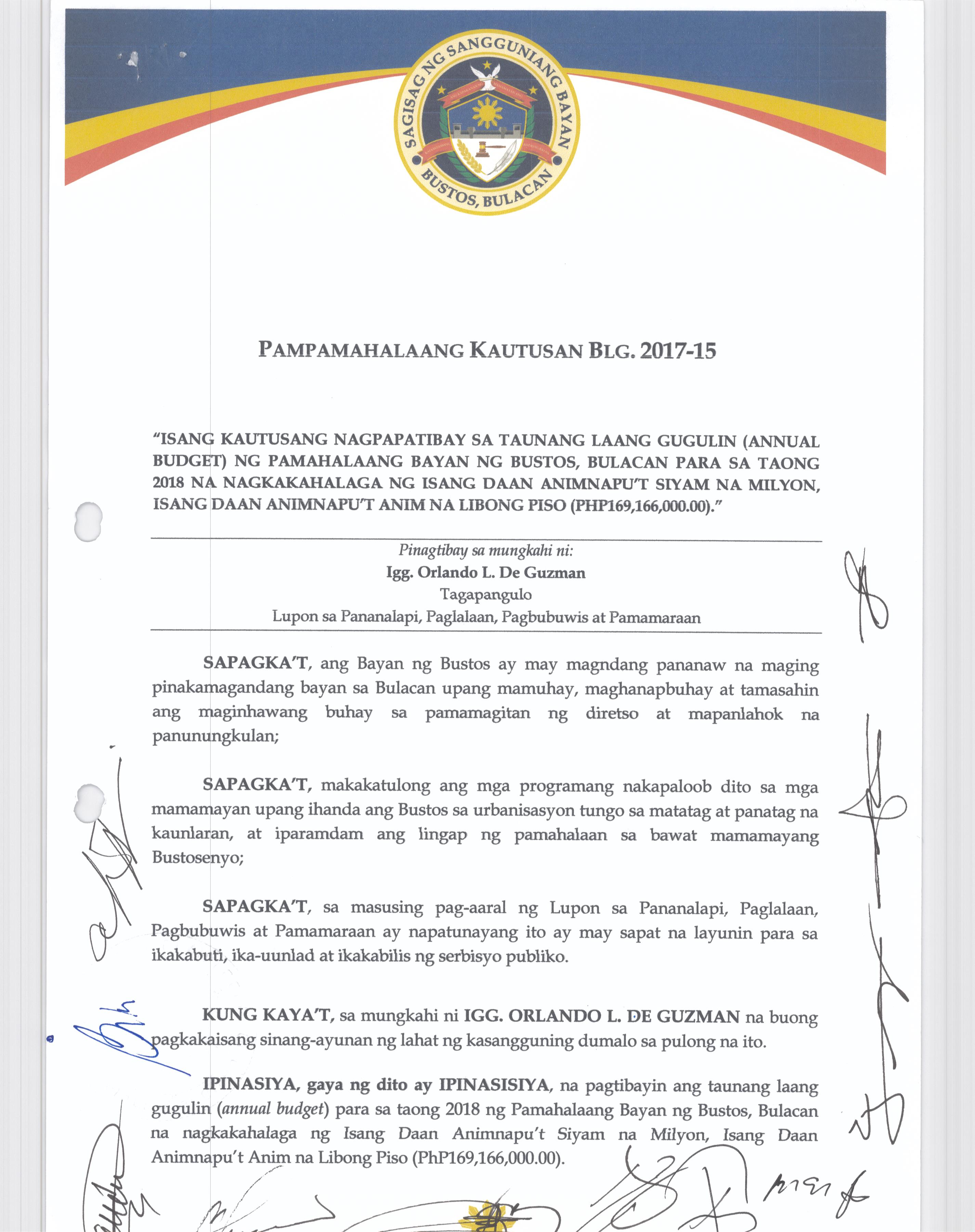 Isang Kautusan nagpapatibay sa TaunangBadyet ng Pamahalaang Bayan ng Bustos Bulacan para sa Taong 2015 na nagkakahalaga ng Php. 129,007,348.