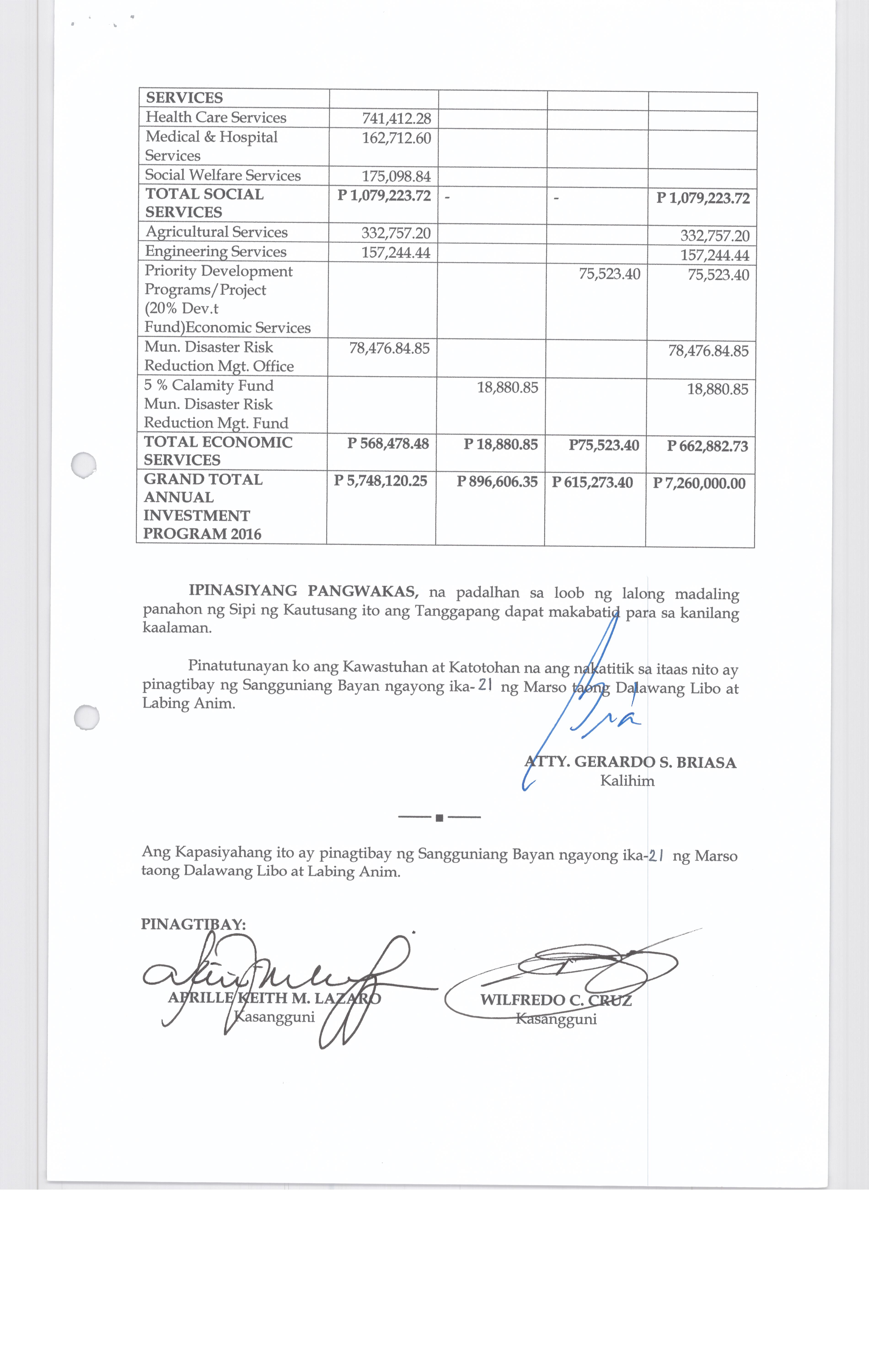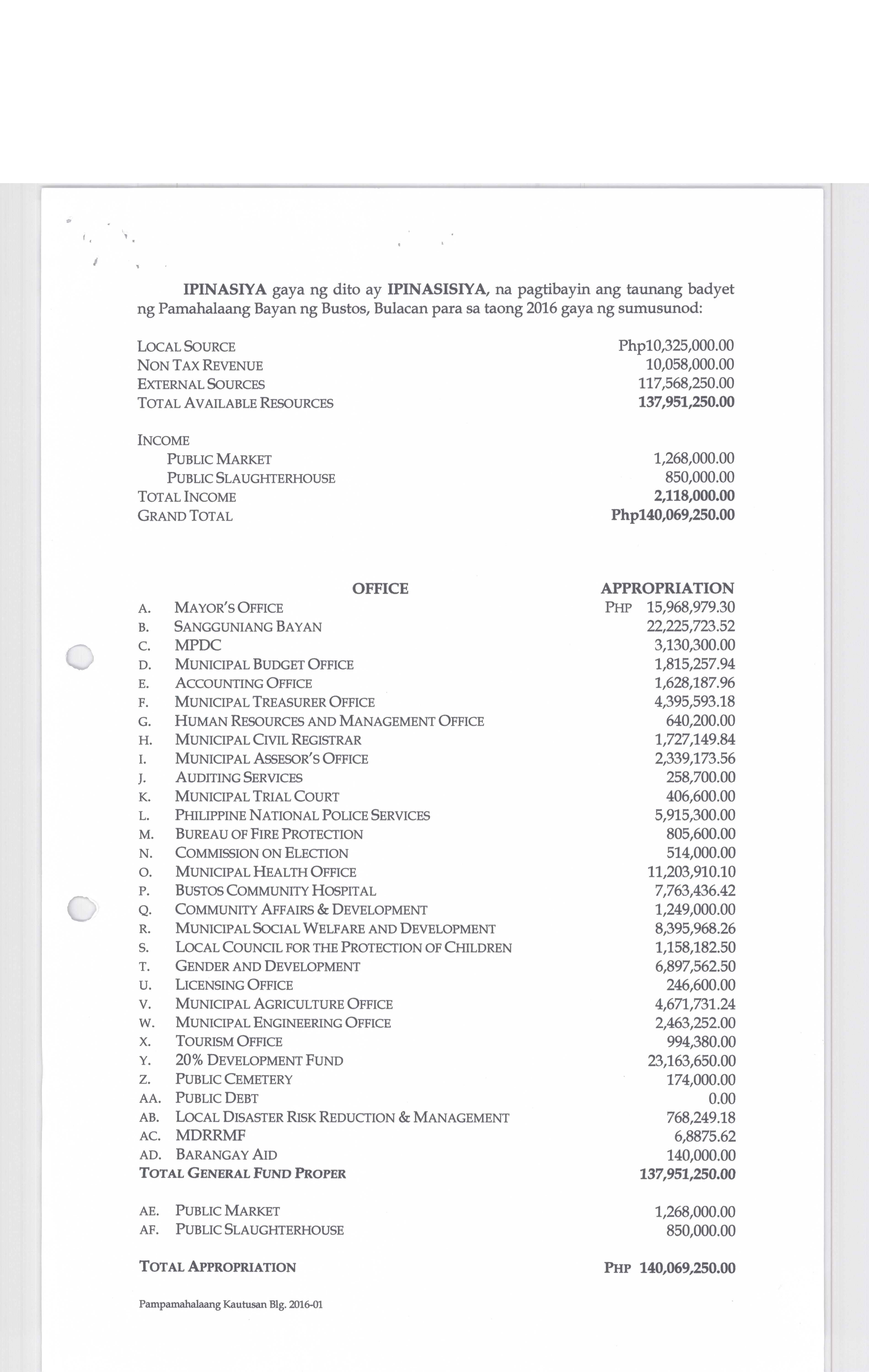 Isang Kautusang Nagpapatibay sa TaunangBadyet ng Pamahalaang Bayan ng Bustos, Bulacan Para sa Taong 2016 ng Php. 140,069,250.00