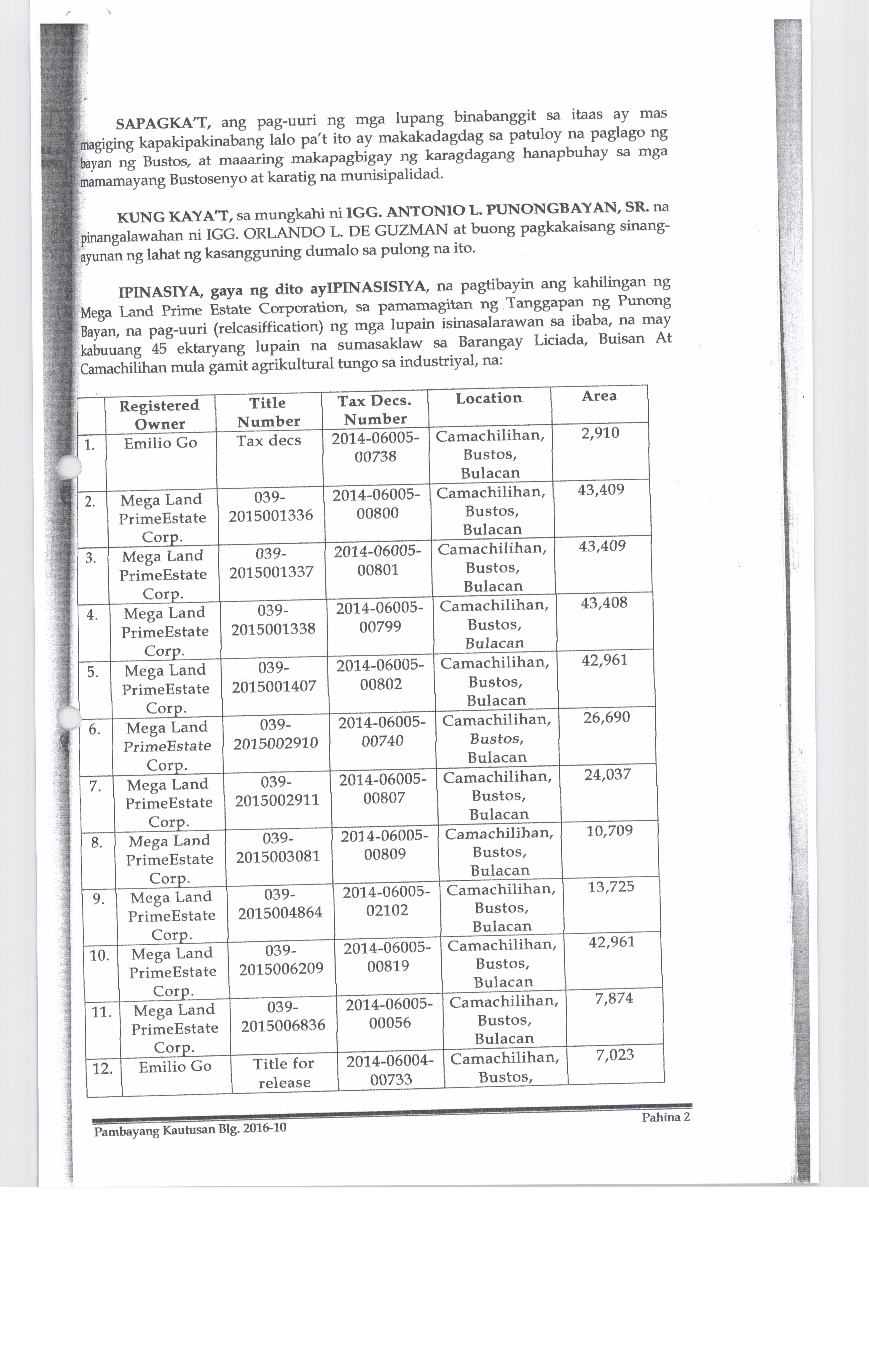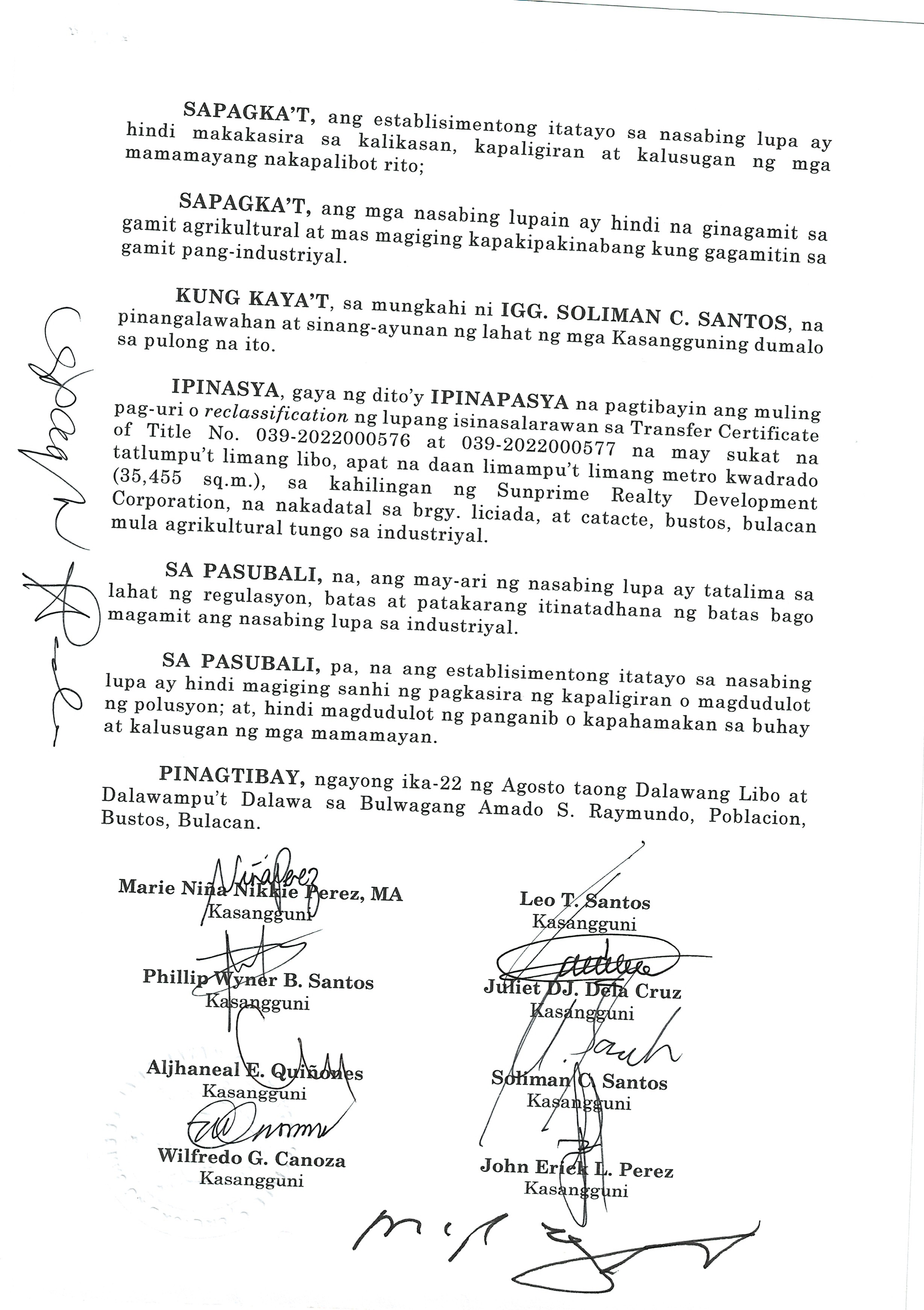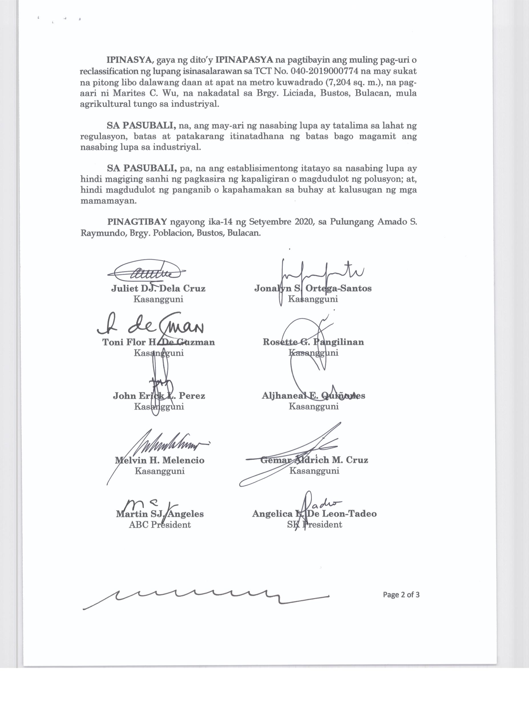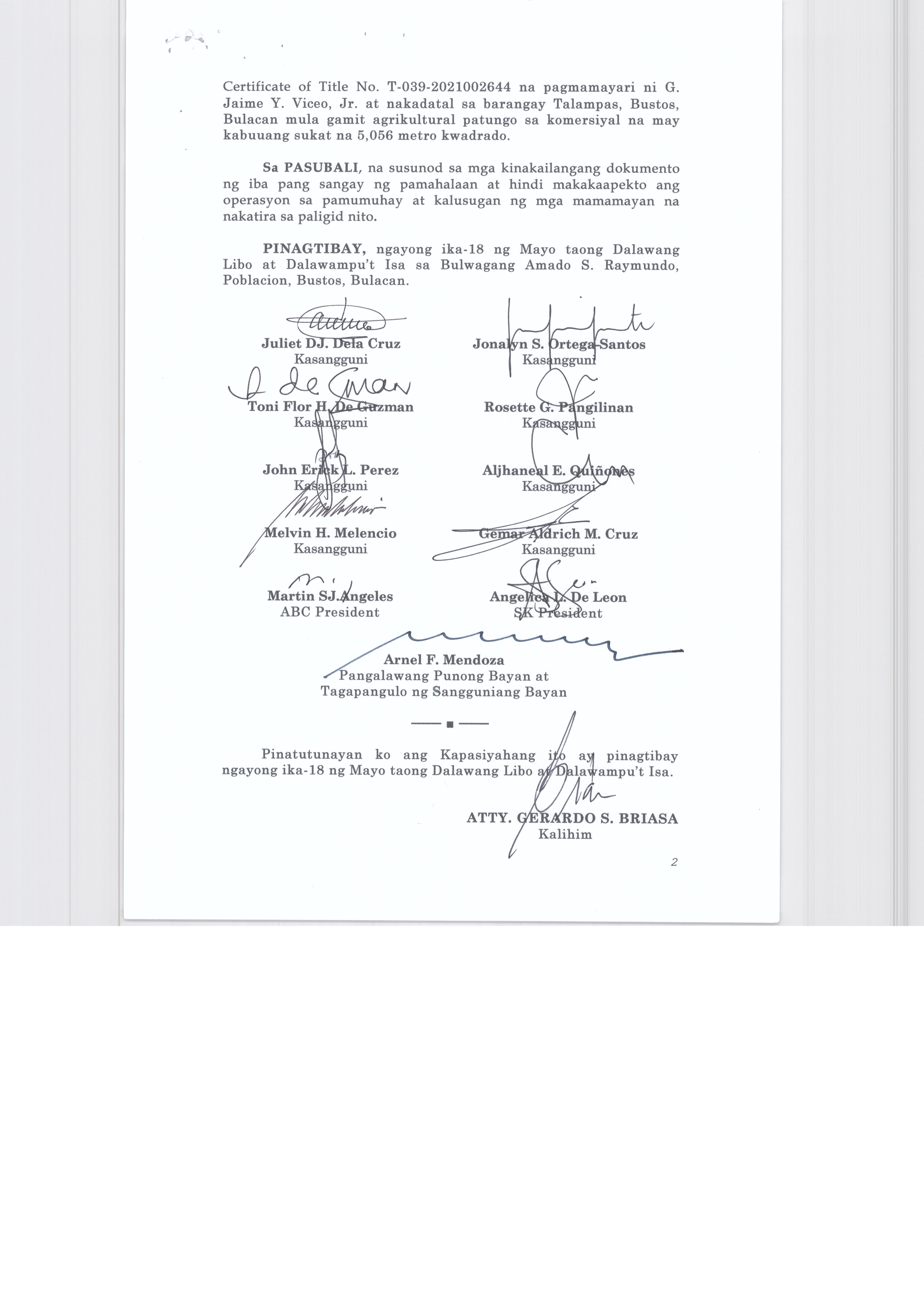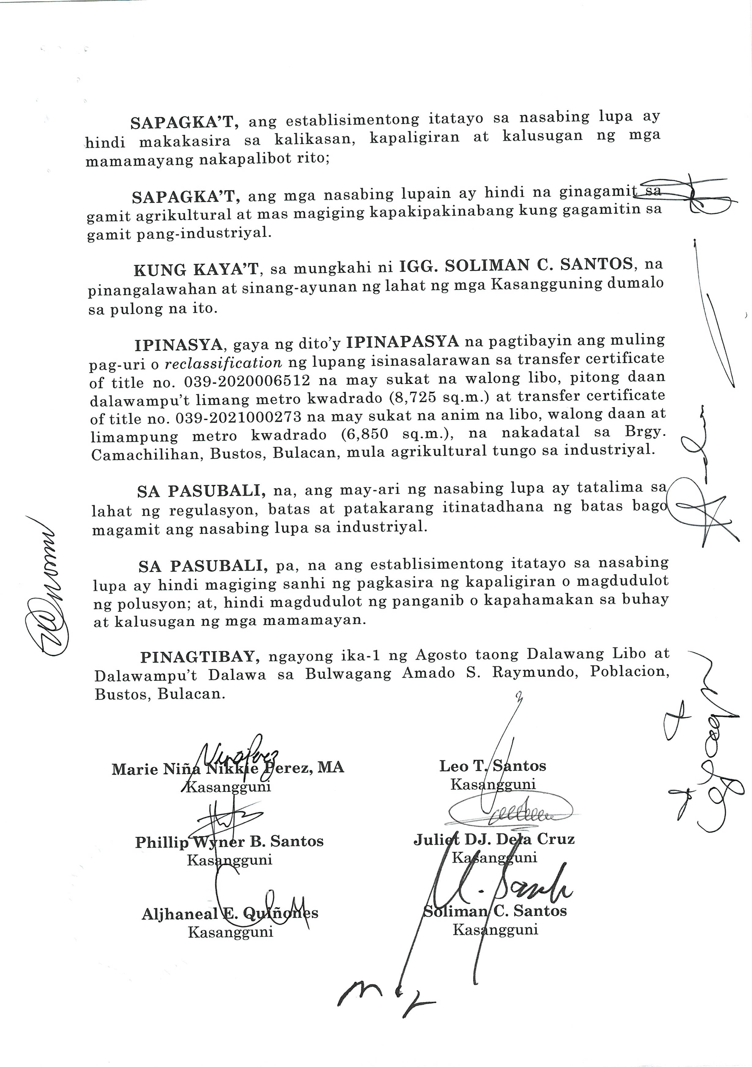 ''NAGPAPATIBAY SA MULING PAG-UURI (RECLASSIFICATION) NG LUPANG ISINASALARAWAN SA TCT No. T-58638/TD ARP No. 2024-06008-01859, TD/ARP No. 2024-06008-02477, TD/ARP No. 2024-06008-00998, TD/ARP No. 2024-06008-00980/TCT No. 039-2022023412, TCT No. 039-2023007154/TD ARP No. 2024-06008-01830, TC ARP No. 2024-06004-00907, TD/ARP No. 2024-06004-00368, TD/ARP No. 2024-06008-02474, TCT No. 039-2019014230, TD/ARP No. 2024-06004-00805/TCT No. P-761 TD/ARP No. 2024-06004-008-2/TCT No. P-760, TD/ARP No. 2024-06004-00804/TCT No. P-759, TD/ARP No. 2024-06008-02633/TCT No. 2025000132, OCT No. 039-R02024000553 (P-10964), TD/ARP No. 2024-06005-01088 NA MAY KABUUANG SUKAT NA ISANG DAAN DALAMPU'T SIYAM NA LIBO, ISANG DAAAN LABING DALAWA AT PITUMPU'T SIYAM NA METRO KWADRADO (129,112.79 SQ. M) NA PAGMAMAY-ARI NG MEGA LAND PRIME ESTATE CORPORATION NA NAKADATAL SA BARANGAY LICIADA, BUISAN AT CAMACHILIHAN BUSTOS, BULACAN MULA AGRIKULTURAL TUNGO SA INDUSTRIYAL.''