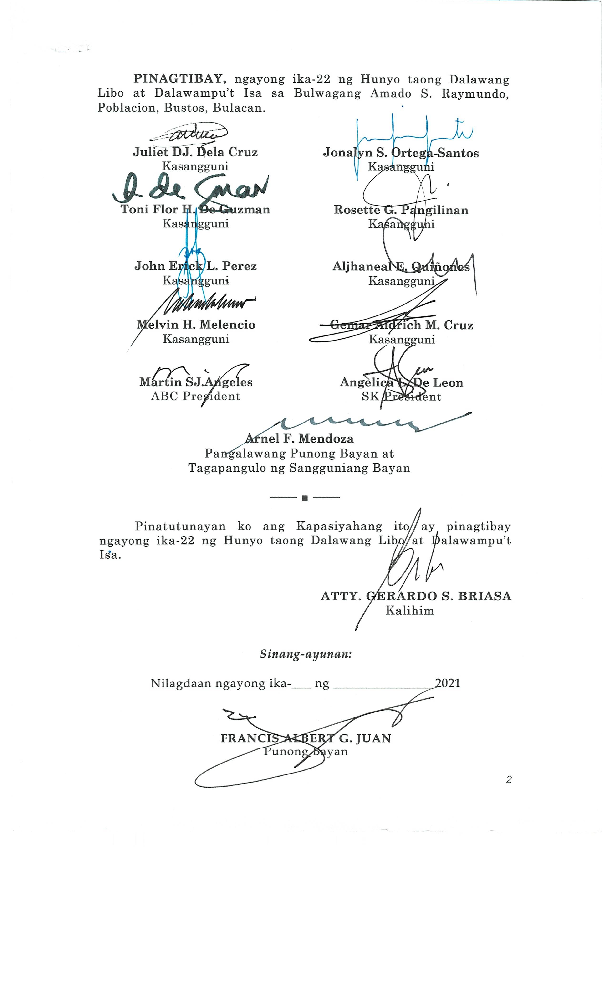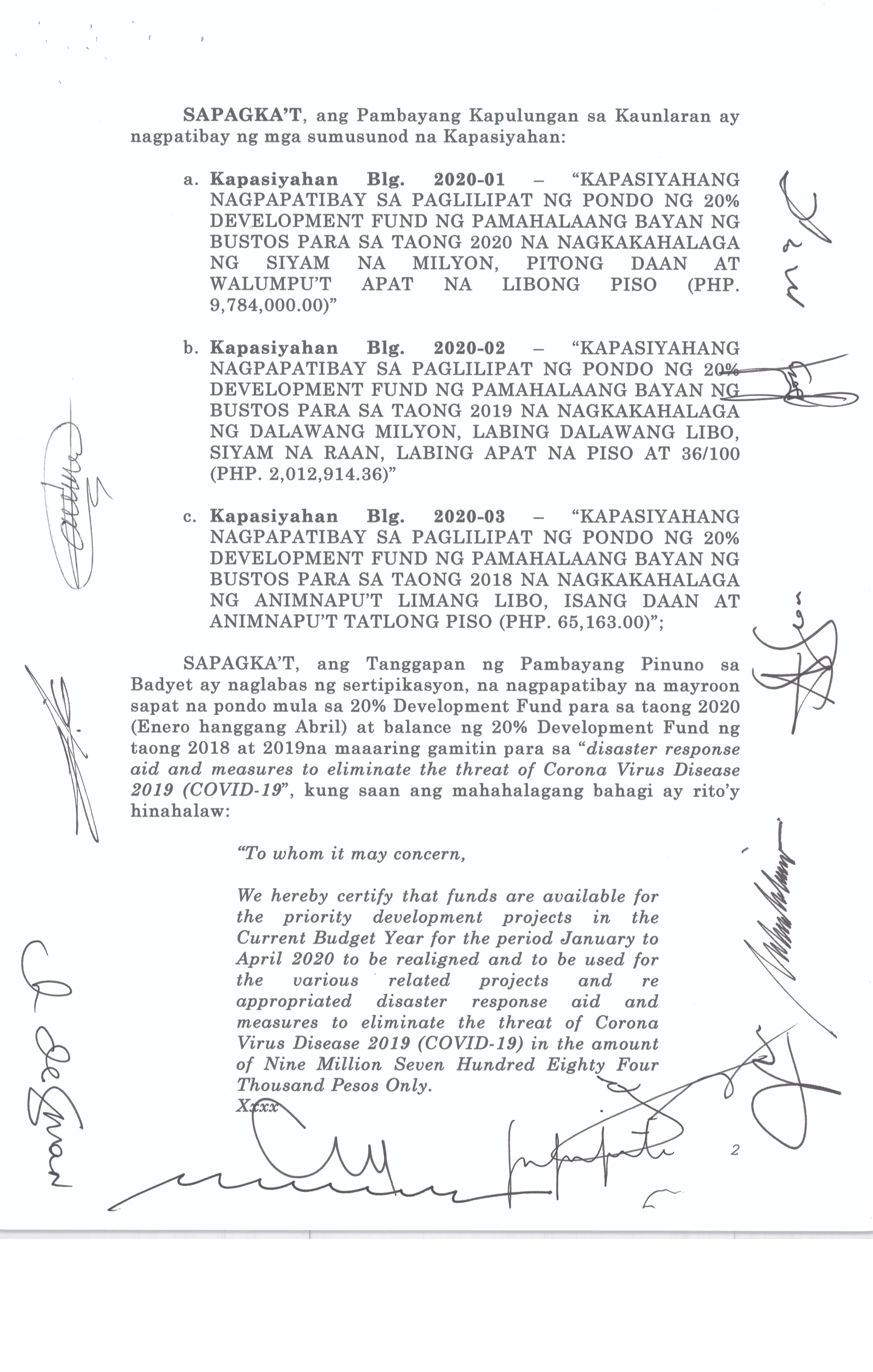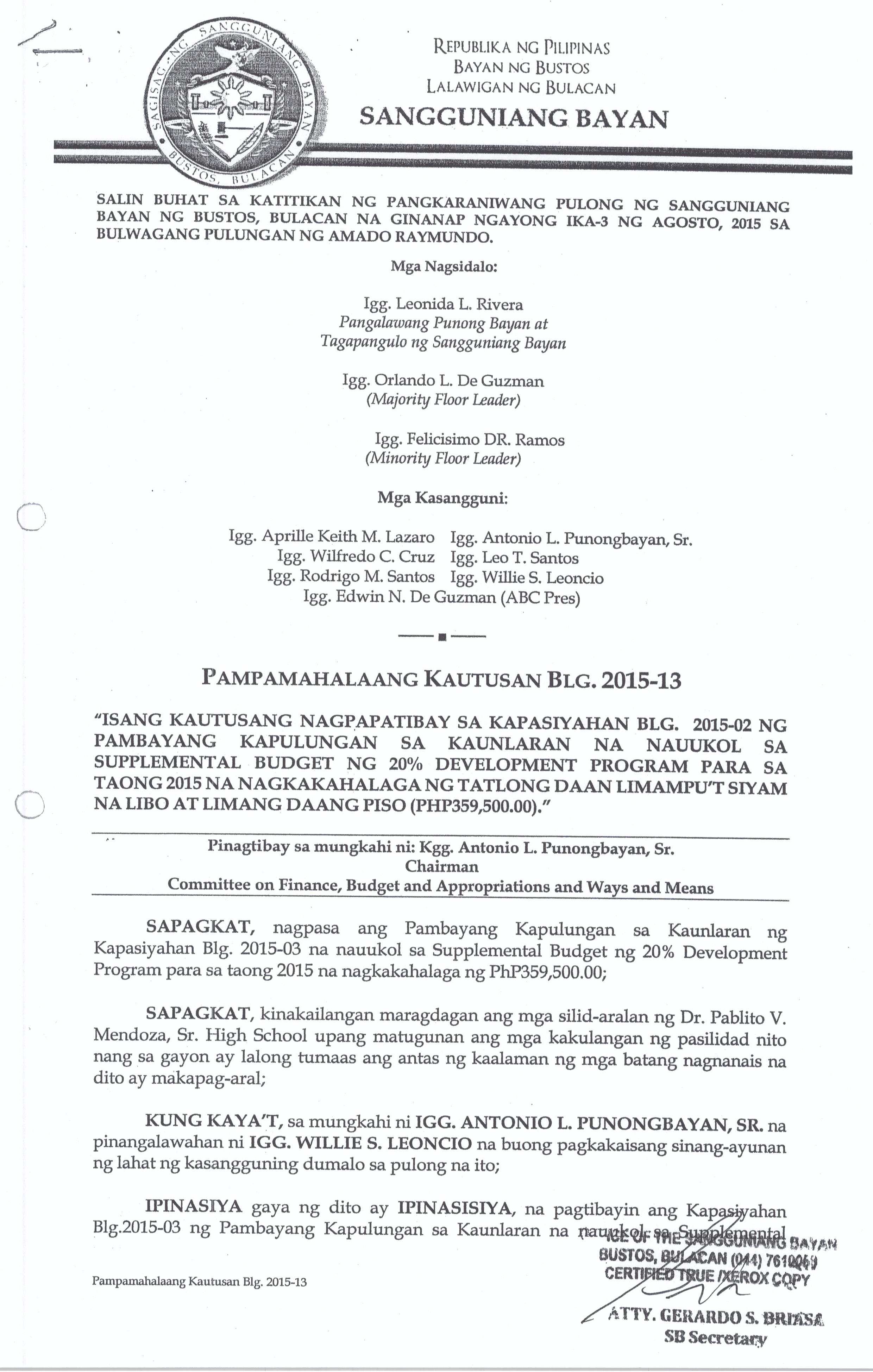 Isang Kautusang Nagpapatibay sa 20% Development Fund ng Pamahalaang Bayan ng Bustos Bulacan para sa Taong 2015 na nagkakahalaga ng Php.21,074,196.80.