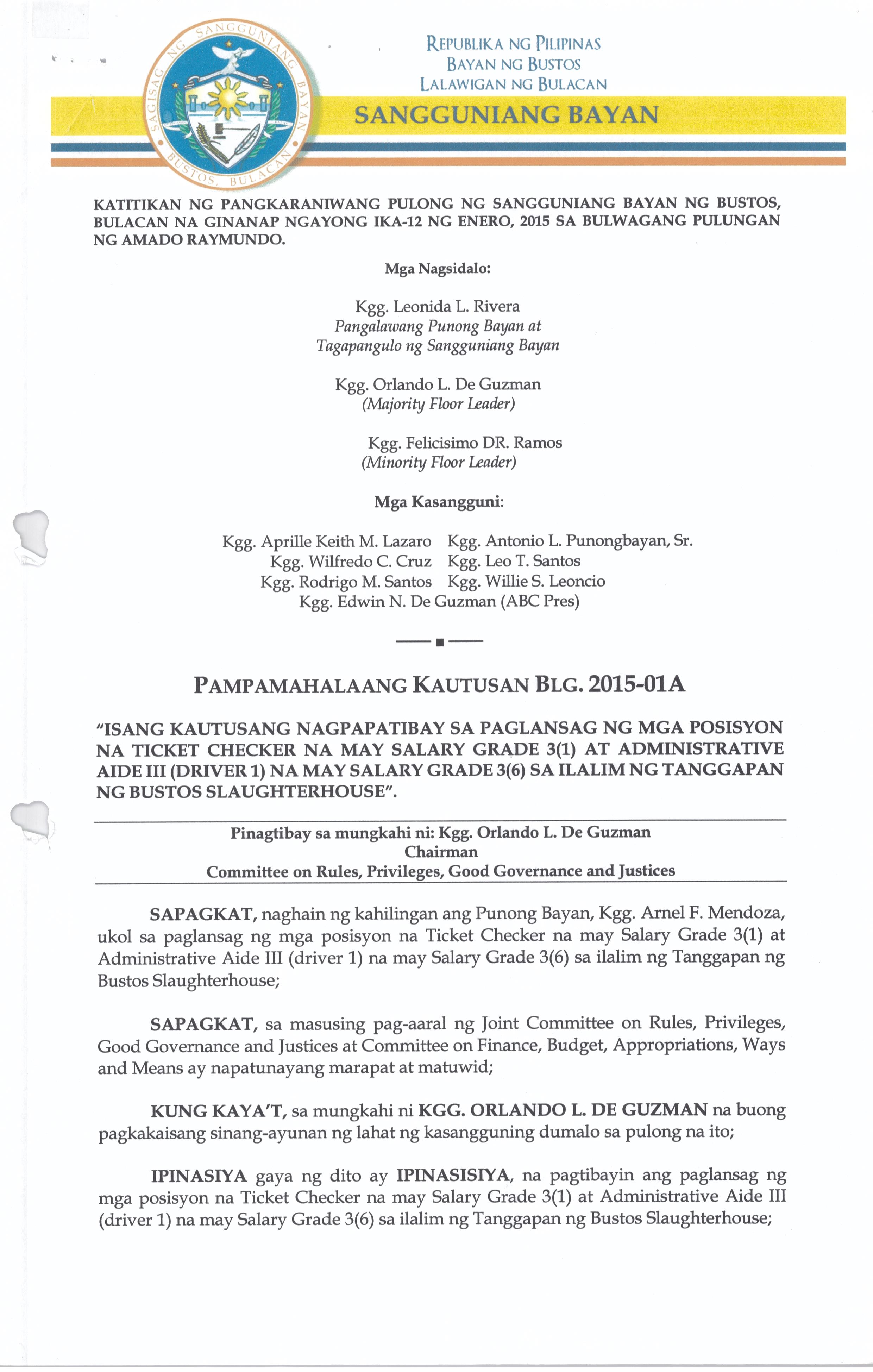 Isang Kautusang nagpapatibay sa Paglansag ng mga Posisyon na Ticket Checker na may salary Grade 3(1) at AdministrativeAidelll ( Driver l) na may Salary Grade 3 (6) sa ilalim ng Tanggapan ng Bustos Slaughter House