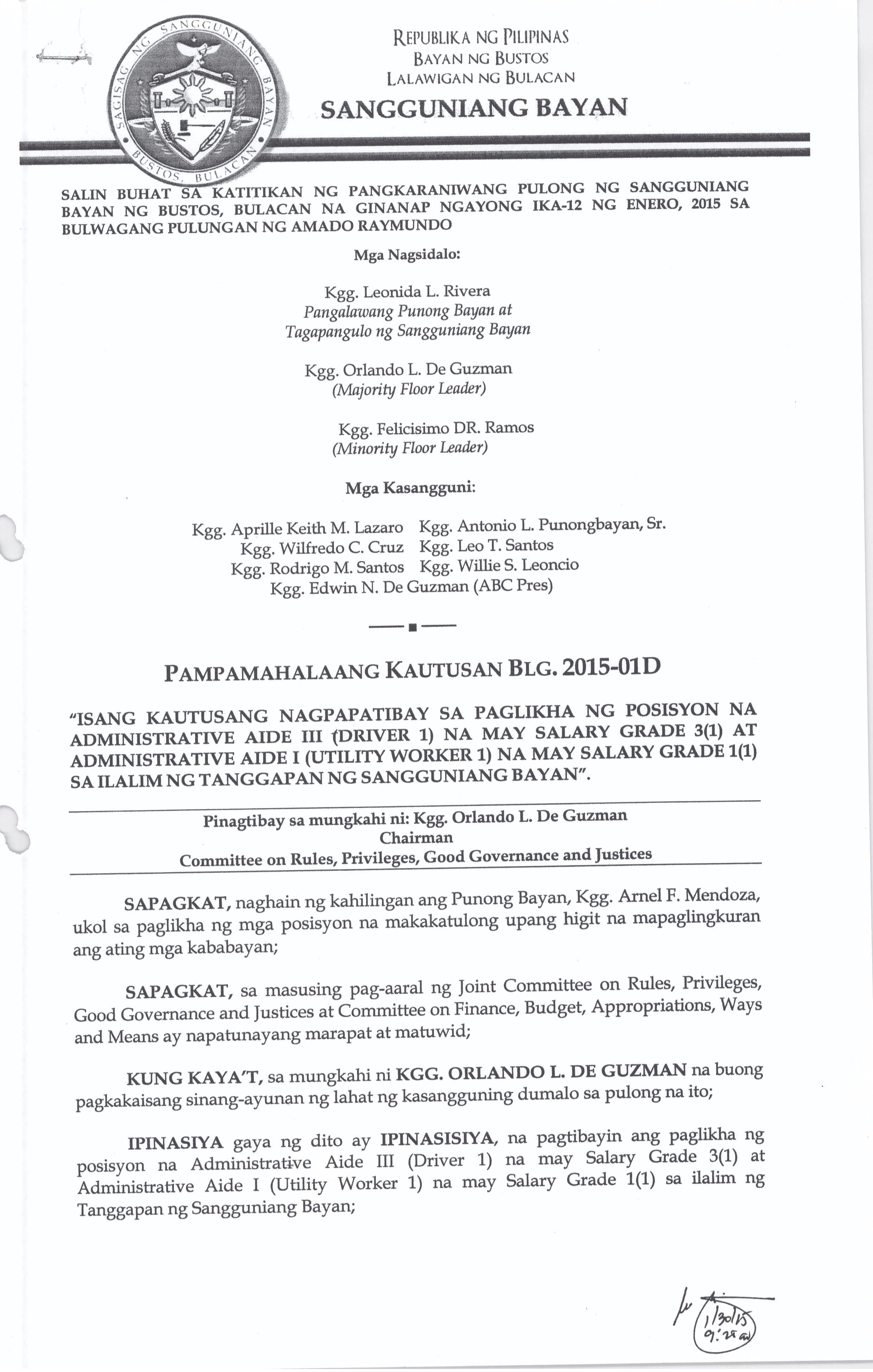 Isang Kautusang nagpapatibay sa Paglikha ng Psisyon na Administrative Aide lll (Driver 1) na may Salary Grade 3(1) at Administrative Aide l (Utility Worker 1 ) na may Salary Grade 1 (1) sa Ilalimn ng tanggapan ng Sangguniang Bayan