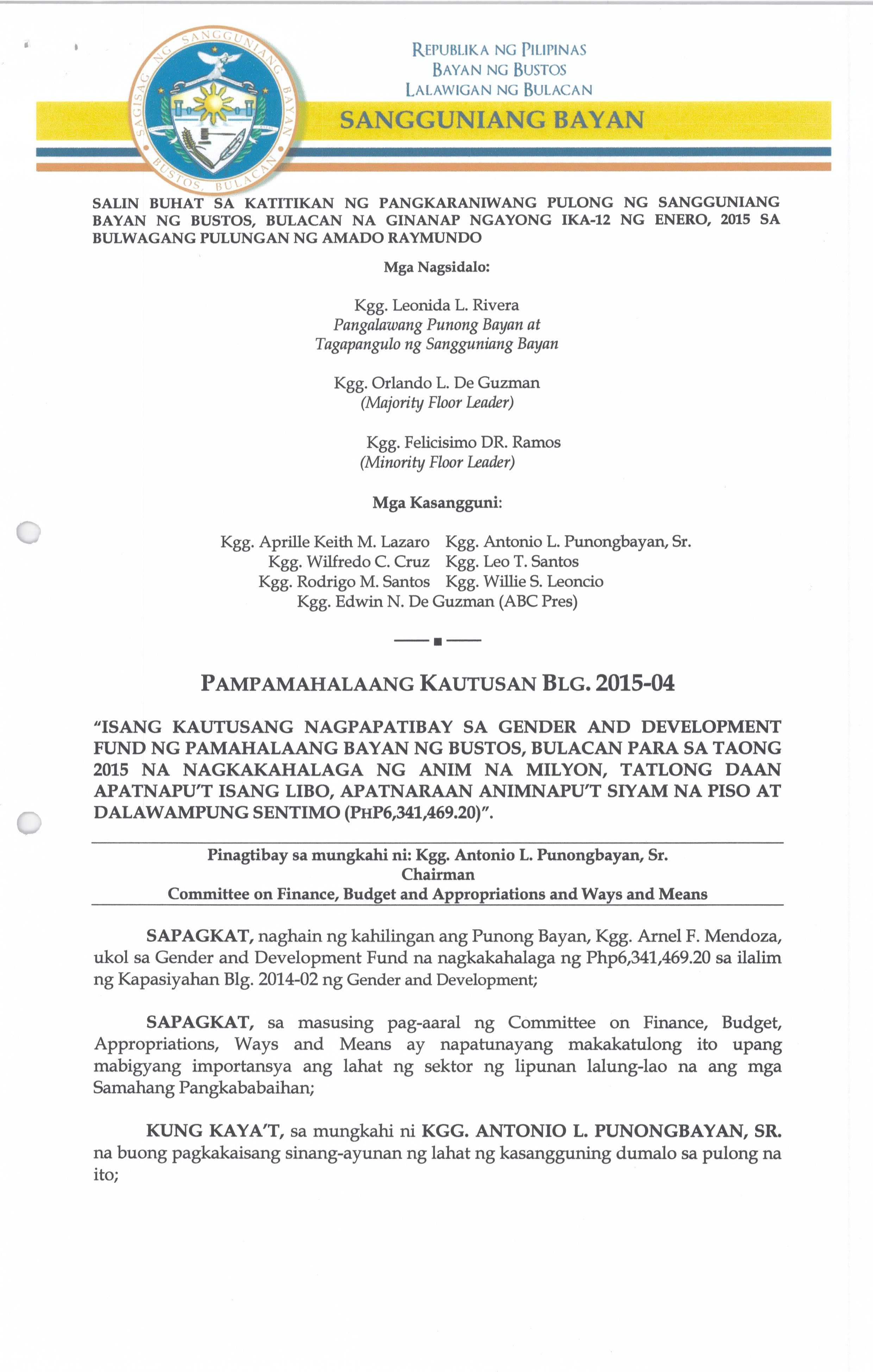 Isang Kautusang Nagpapatibay sa Gender and Development Fund ng Pamahalaang Bayan ng Bustos Para sa Taong 2015 na nagkakahalaga ng Php.6,315,944.20