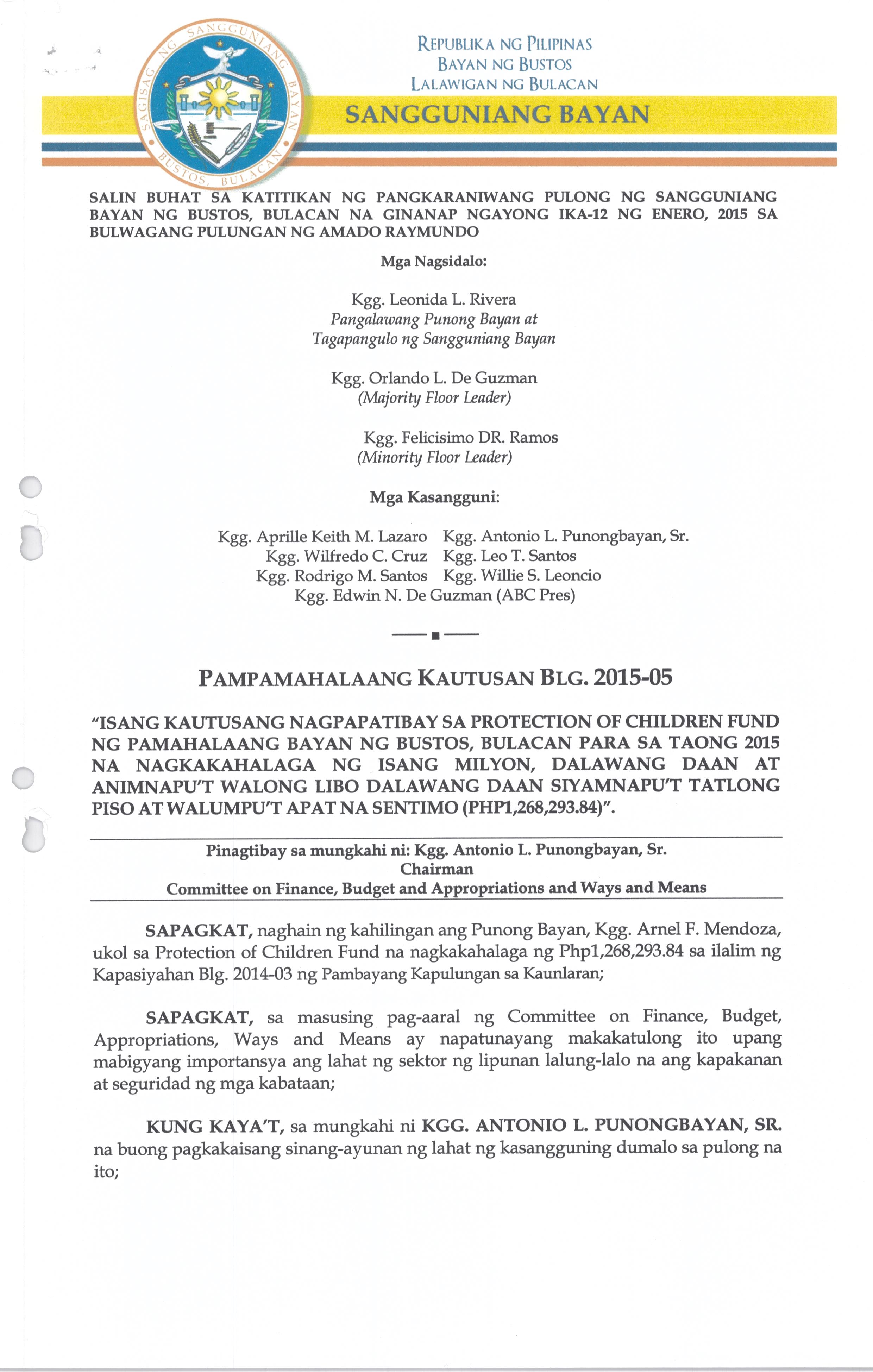 Isang kautusang Nagpapatibay sa Protection of Children Fund ng Pamahalaang Bayan ng Bustos para sa Taong 2015 na nagkakahalaga ng Php.1,268,293.84