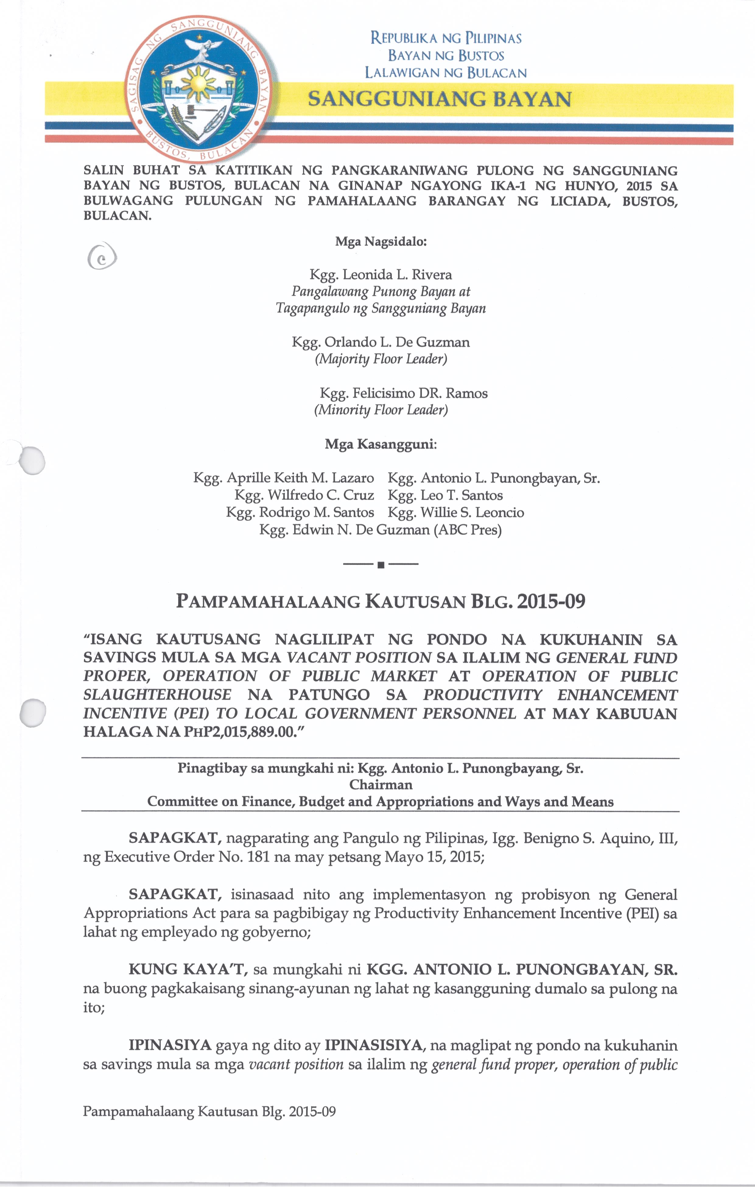 Isang Kautusang naglilipat ng Pondo na Kukuhanin sa savings mula sa mga Vacant Position sa Ilalim ng General Fund Proper, Operation of Public Market at Operation of Public Slaughterhouse na Patungo sa Productivity Enhancement Incentive (PEI) to Local Government Personel at may Kabuuanghalaga na Php.2,015,899.00.