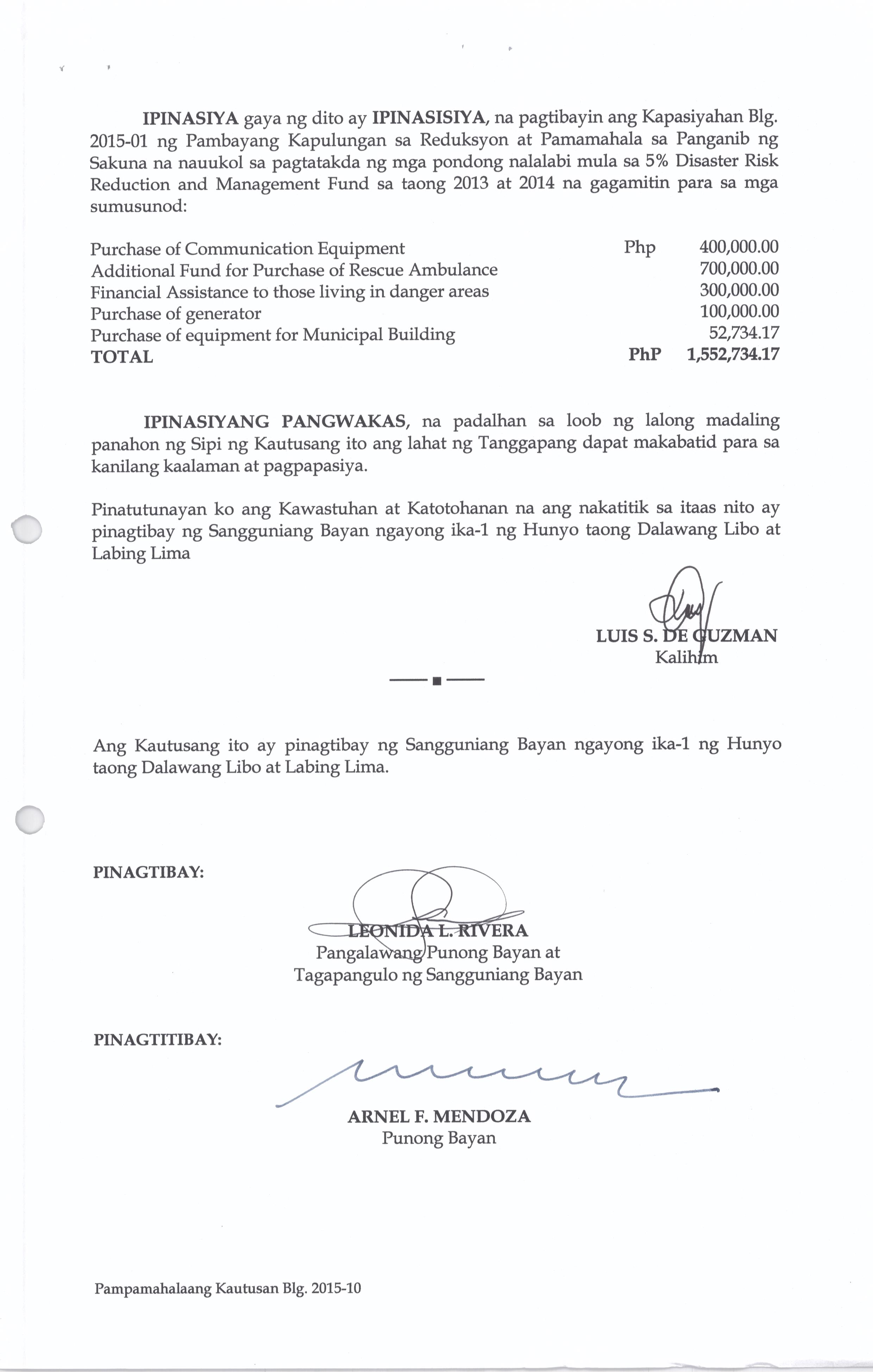 Isang Kautusang Nagpapatibay sa Kapasiyahan Blg. 2015-01 ng Pambayang Kapulungan sa Reduksyon at Pamamahala sa Panganib ng Sakuna na nauukol sa Pagtatakda ng mga PondongNalalabi mula sa 5% Disaster Risk and Reduction and Management Fund sa Taong 2013 at 2014 na nagkakahalaga ng Php. 1,552,734.17.