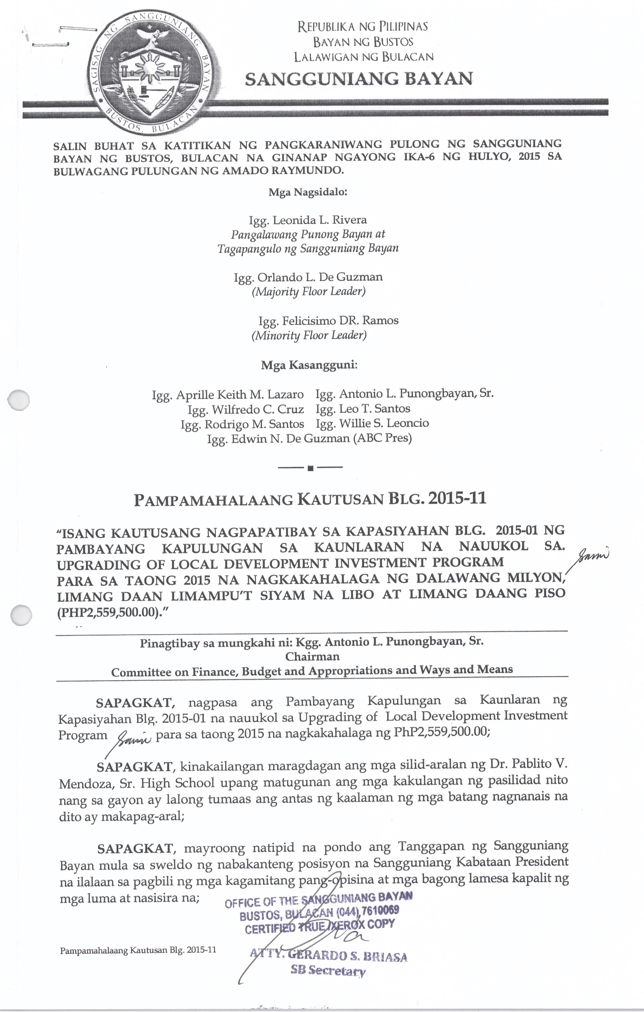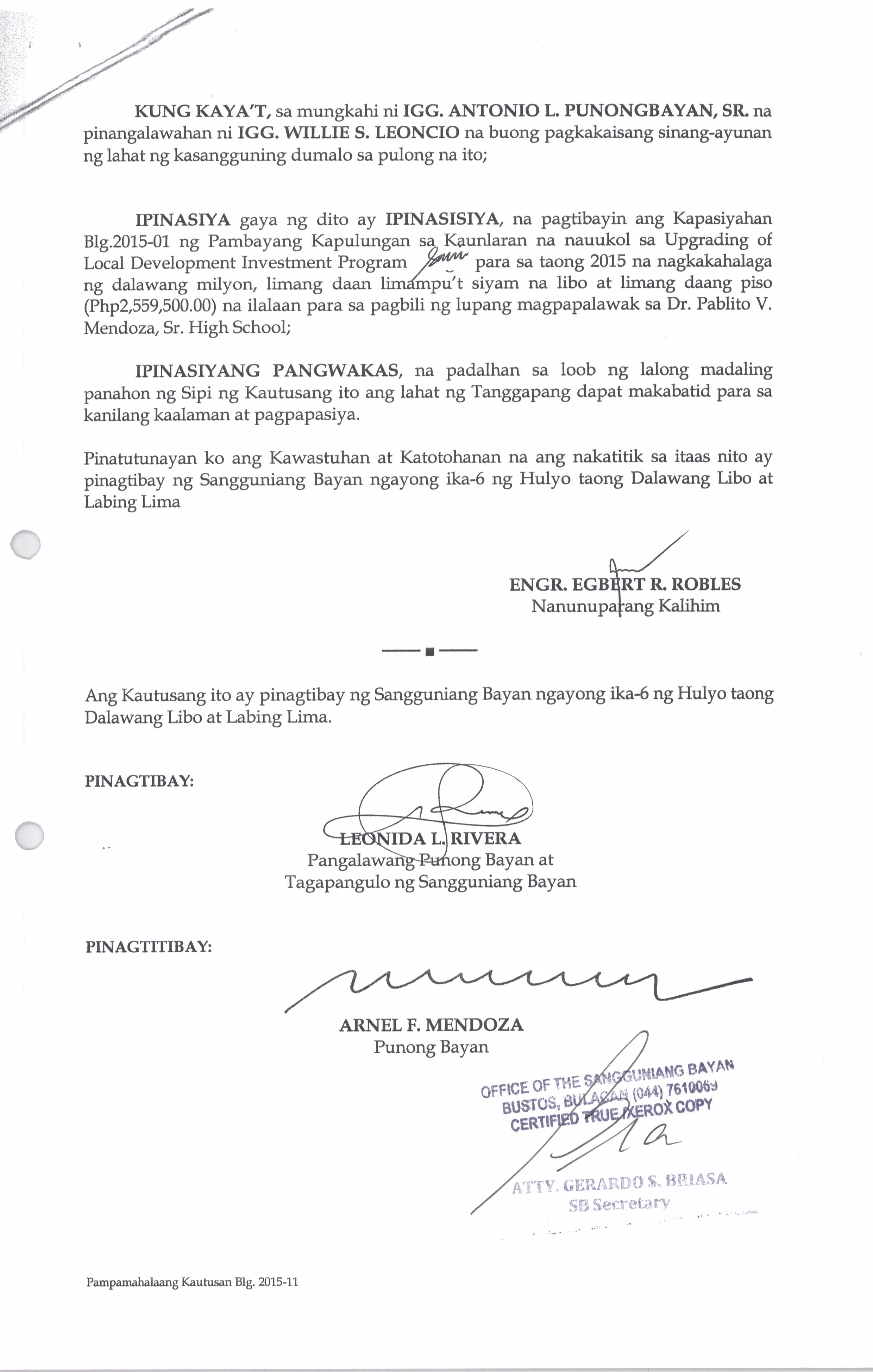 Isang Kautusang Nagpapatibay sa Kapasiyahan Blg.2015-01 ng Pambayang Kapulungan sa Kaunlaran na Nauukol sa Upgrading of Local Development Investment Program para sa Taong 2015 na nagkakahalaga ng Php.2,559,500.00.