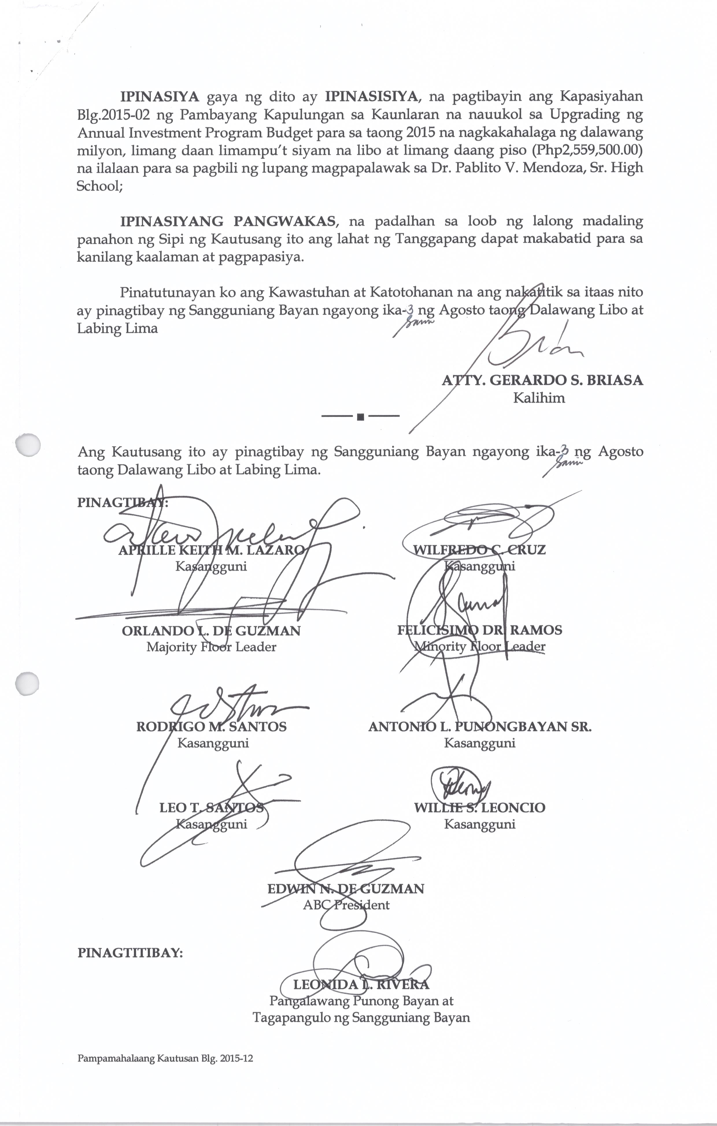 Isang Kautusang Nagpapatibay sa Kapasiyahan Blg. 2015-02 ng Pambayang Kapulungan sa Kaunlaran na nauukol sa Upgrading ng Annual Investment Program Budget para sa Taong 2015 na nagkakahalaga ng Php.2,559,500.00.